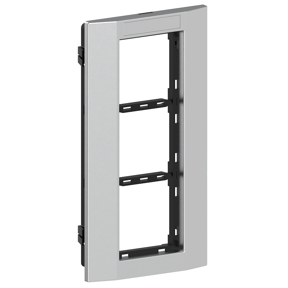 Dreifach Einbaurahmen zur Aufnahme von kompakten M45 Einbaugeräten im Format 45x45 mm (3 Einzel-Installationsgeräte oder eine Mehrfach-Steckdose), bestehend aus Montageträger und Abdeckrahmen mit Beschriftungsfeld 8x40mm, zur Installation in Brüstungskanälen und Installationssäulen mit einer 76,5 mm breiten Befestigungsspur, für die vertikale Geräteinstallation.