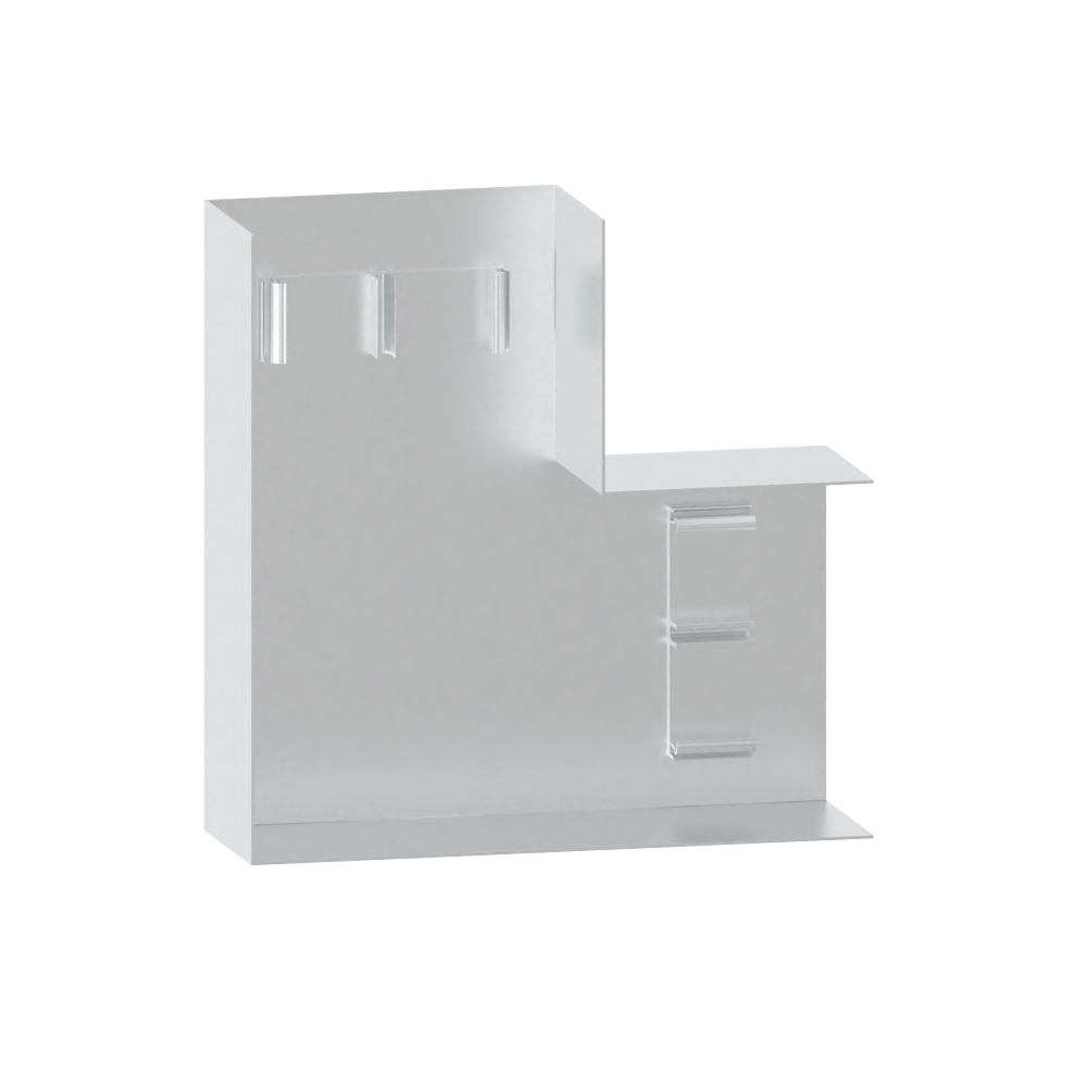 Flachwinkel als schnittkaschierendes Haubenformteil zu Brüstungskanal aus Aluminium, für die Leitungsverlegung mit einer 90°-Richtungsänderung auf der Wand, Schenkellänge: 200 mm.