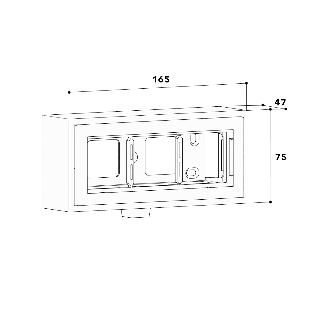 Aufputzgehäuse für die direkte Montage am Leitungsführungskanal als Profilabschluss, für den Geräteeinbau von drei kompakten M45 Einbaugerät im Format 45x45 mm (3 Einzel-Installationsgeräte oder eine Mehrfach-Steckdose), mit Zuführungsabdeckung für den Leitungsführungskanal.