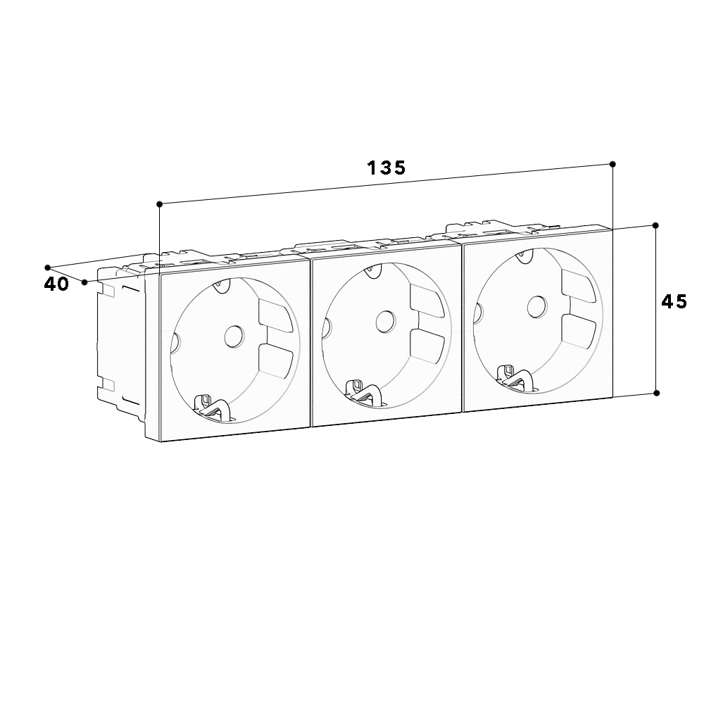 Dreifach Einbausteckdose, 0° gerade, Leitungsanschluss über Steckklemmen, 2-polig, 16 A/250 V~, mit Verbindungsklemmen nach VDE 0620, geeignet für 3 Winkel- oder Flächenstecker, mit erhöhtem Berührungsschutz gemäß VDE 0620, zur Installation in Brüstungskanälen mit 45 mm Oberteil und allen Einbaurahmen/Geräteträgern zur Aufnahme von kompakten M45 Einbaugeräten, für die waagerechte Geräteinstallation. Hinweis: Die Zugentlastung ist separat zu bestellen.
