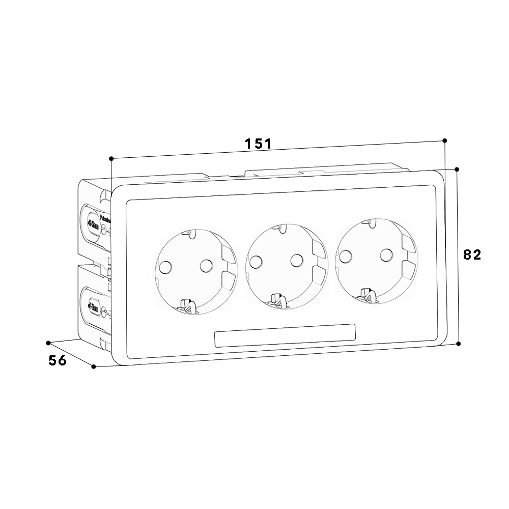 Dreifach Kanal-Steckdose inklusive Einbaudose, Leitungsanschluss über Steckklemmen, 2-polig, 16 A/250 V~, mit Verbindungsklemmen nach VDE 0620, geeignet für 3 Winkel- oder Flächenstecker, mit erhöhtem Berührungsschutz, mit Beschriftungsfeld 7x64mm, zur Installation in Brüstungskanälen mit einer 76,5 mm breiten Befestigungsspur.