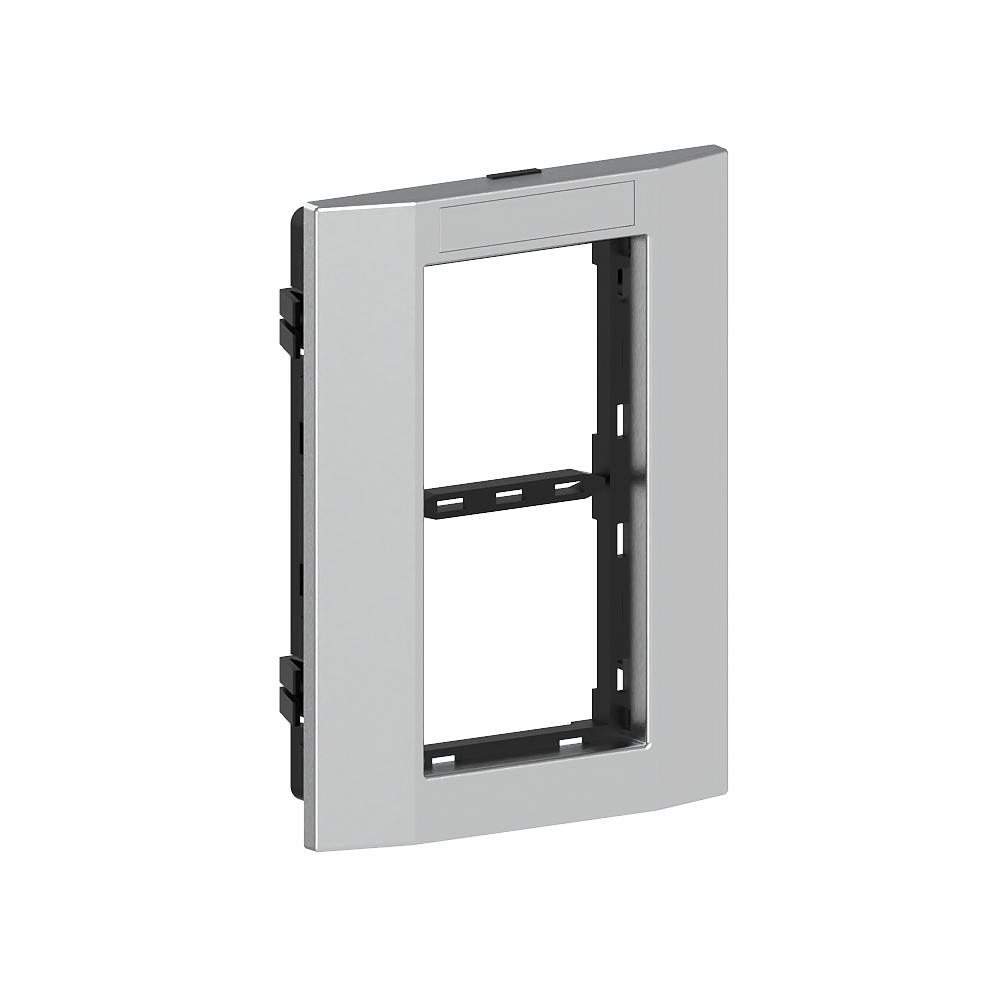 Double mounting frame for accommodating compact M45 built-in devices in 45x45 mm format (2 single installation devices or one multiple socket outlet), consisting of mounting support and cover frame with labelling field 8x40mm, for installation in wall trunking and service poles with a 76.5 mm wide fixing track, for vertical device installation.