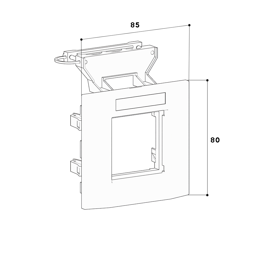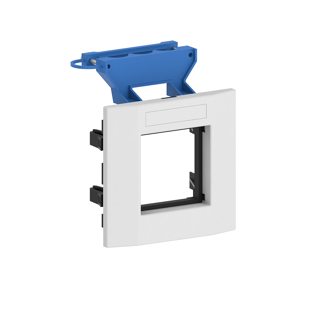 Mounting frame to accommodate one compact M45 recessed unit in 45x45 mm format, consisting of mounting support and cover frame with 8x40mm labelling field, with cable fixing, for installation in wall trunking and service poles with a 76.5 mm wide fixing track, for vertical unit installation.