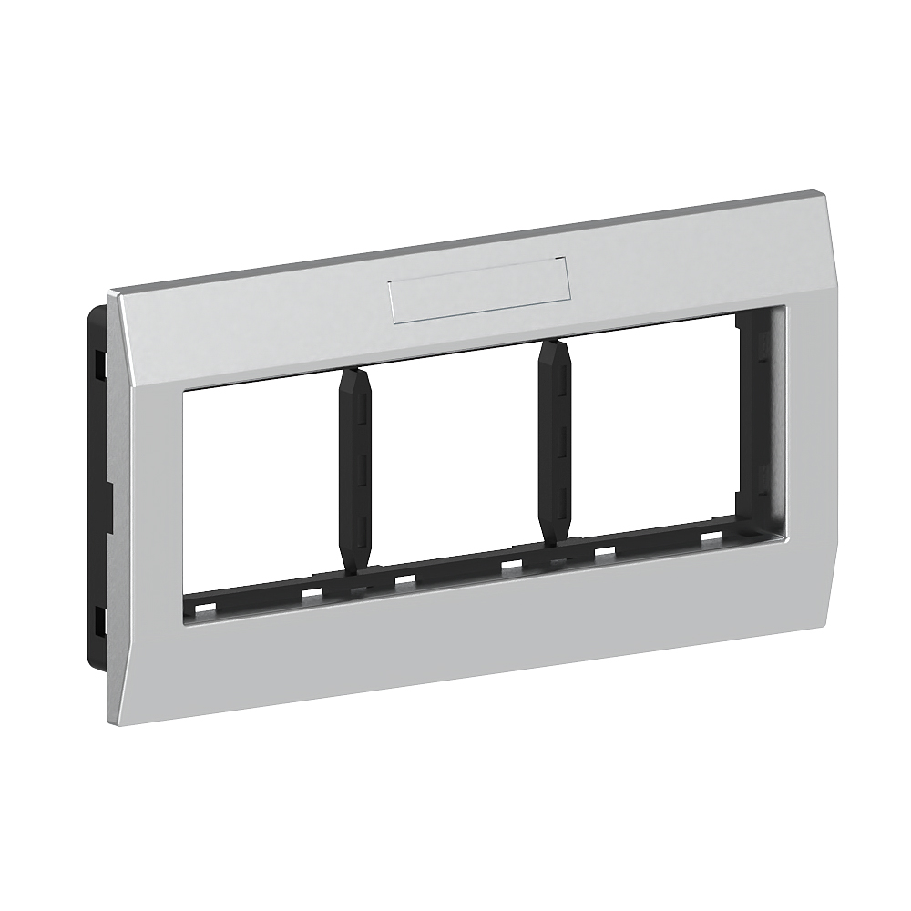 Triple mounting frame for accommodating compact M45 built-in devices in 45x45 mm format (3 single installation devices or one multiple socket outlet), consisting of mounting support and cover frame with labelling field 8x40mm, for installation in wall trunking and service poles with a 76.5 mm wide fixing track, for vertical device installation.