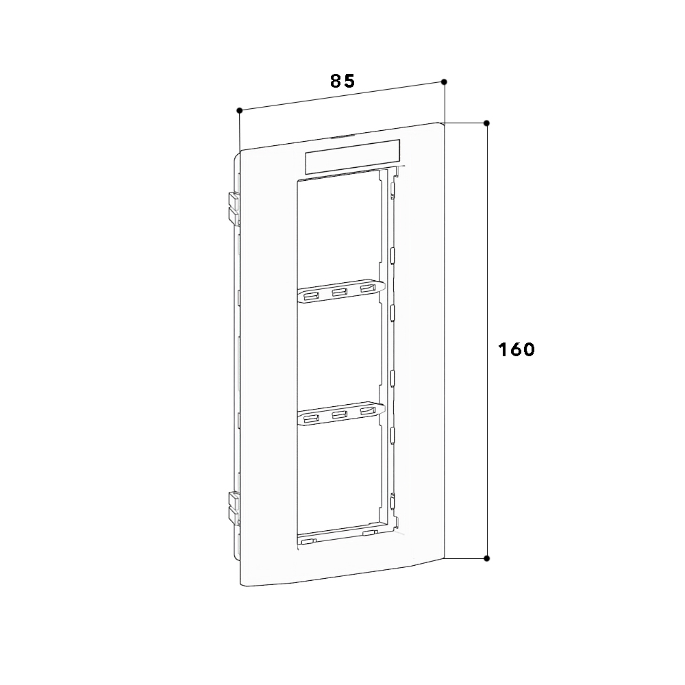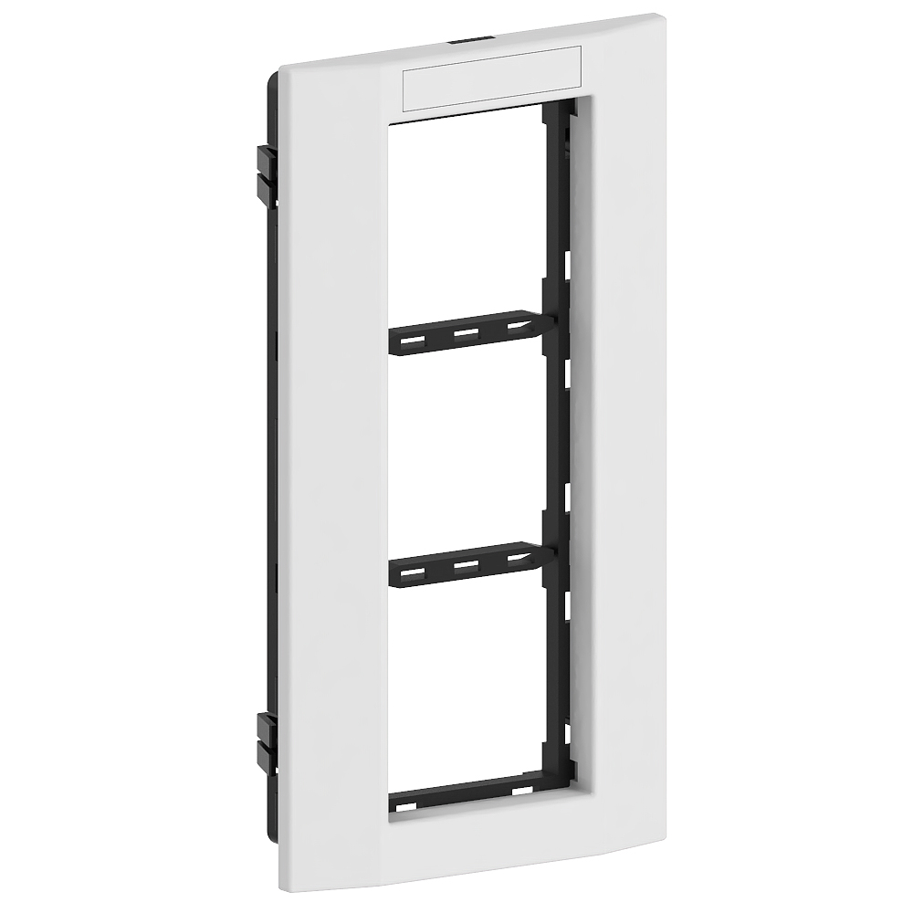 Triple mounting frame for accommodating compact M45 built-in devices in 45x45 mm format (3 single installation devices or one multiple socket outlet), consisting of mounting support and cover frame with labelling field 8x40mm, for installation in wall trunking and service poles with a 76.5 mm wide fixing track, for vertical device installation.