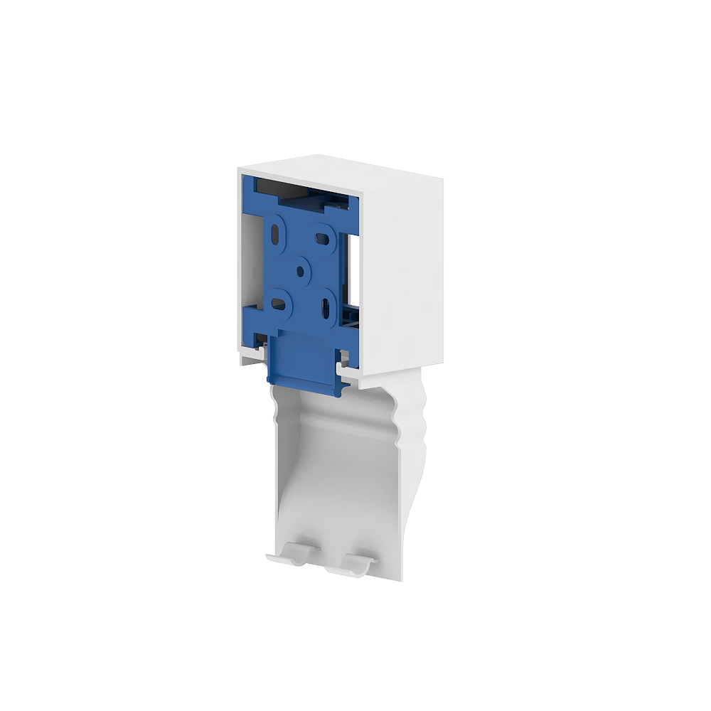 Appliance box for the 4D E skirting trunking "Belle epoque", for device installation of a compact M45 built-in device in the format 45x45 mm (e.g. socket outlet, data socket outlet, antenna socket outlet, USB charging socket outlet, switch), device support with transition cover to the skirting and support profile including fixing material for screwing above the skirting trunking base. Note: The covers of the skirting trunking can be slid sideways under the transition cover of the device support, whereby the transition cover of the device support performs a cut-covering function for the covers of the skirting trunking.