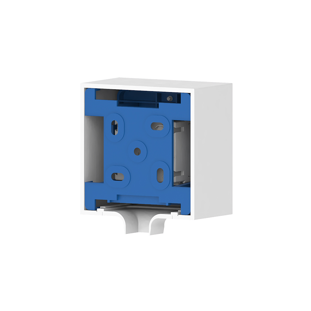 Surface-mounted box for direct mounting on the cable duct as profile termination, for device installation of a compact M45 built-in device in the format 45x45 mm, with connector for the installation trunking.