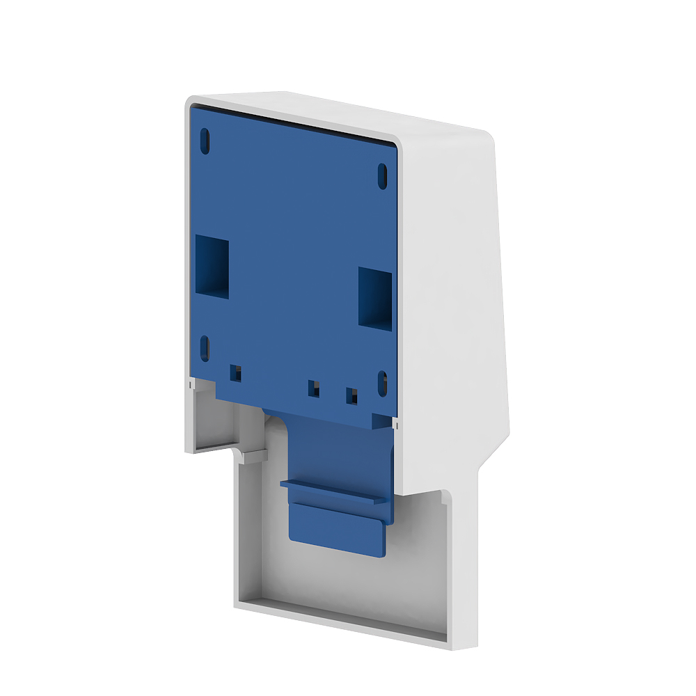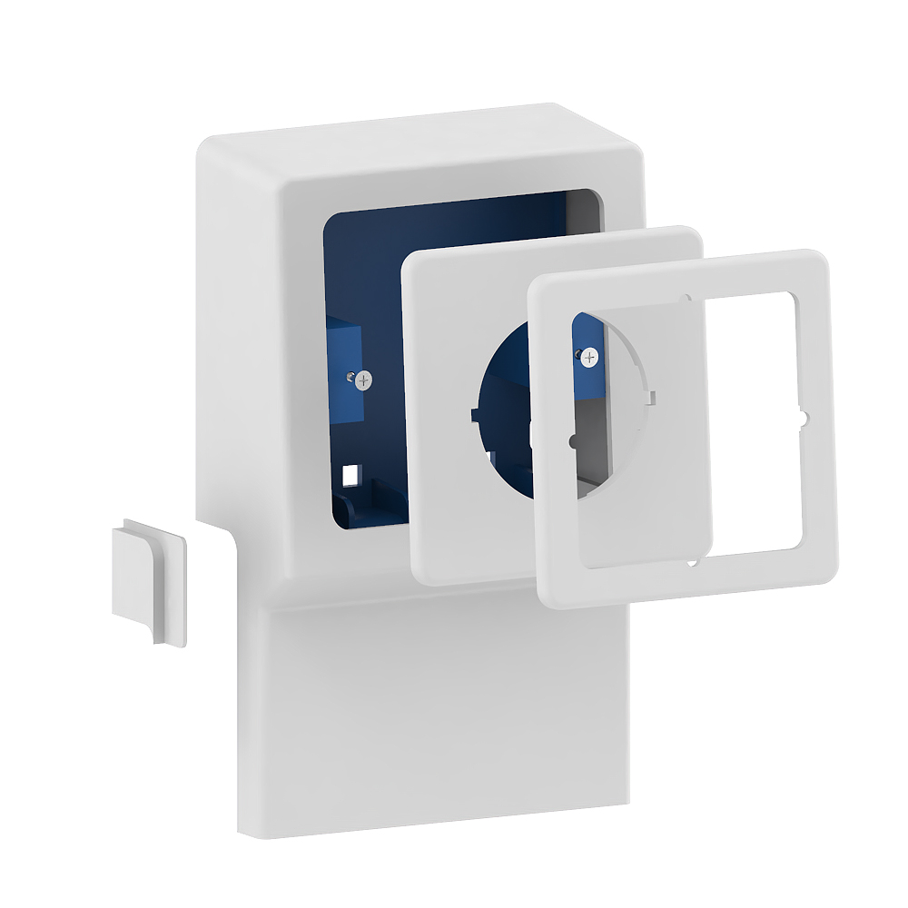 Appliance box for the skirting trunking, with round and angular central disc for device installation of data sockets, device support base with four fixing points for screwing above the skirting trunking base. With the aid of the enclosed compensating pieces, the gear tray can be used for both profile heights of the skirting trunking (SL 20x50 and SL 20x70). Note: The covers of the skirting trunking can be pushed sideways under the cover of the equipment support, whereby the cover of the equipment support performs a cut-covering function for the covers of the skirting trunking.