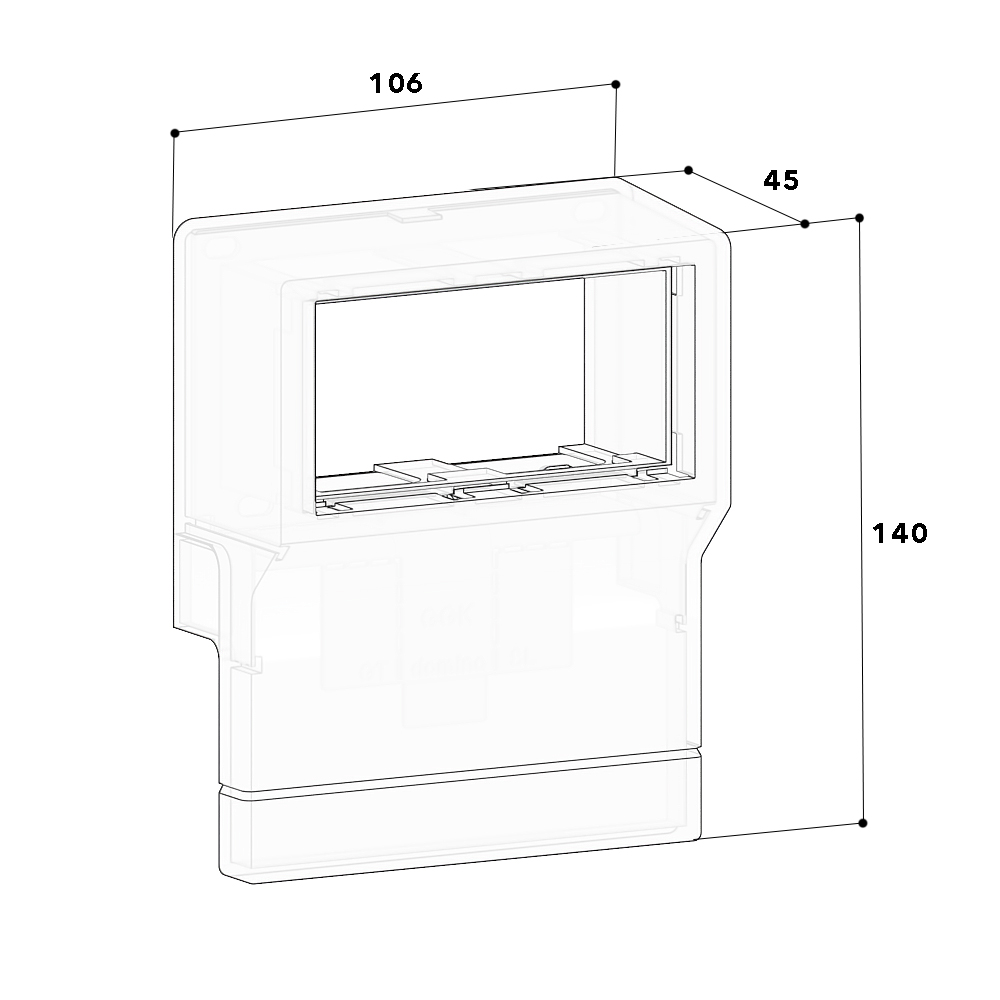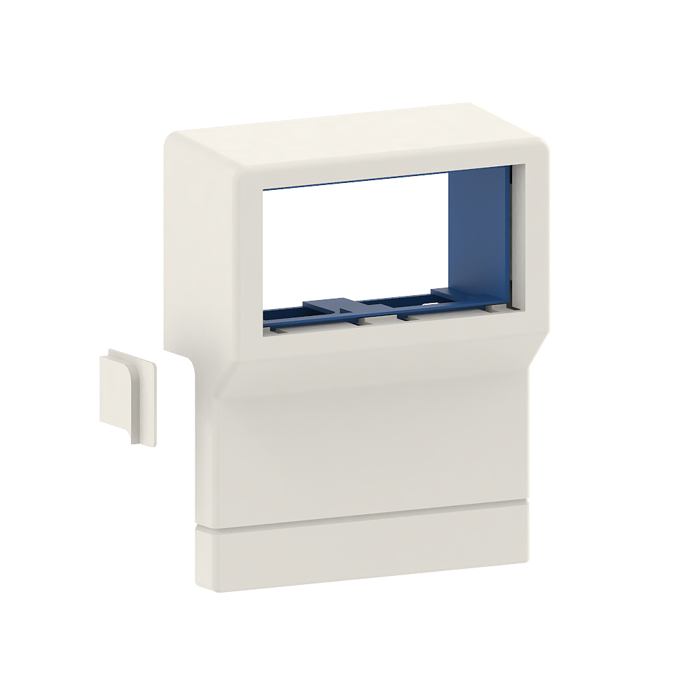 Appliance box for skirting board trunking, for device installation of two compact M45 built-in devices in 45x45 mm format, device support base with four fastening points for screwing above the skirting board trunking base. With the aid of the enclosed compensating pieces, the device support can be used for both profile heights of the skirting trunking (SL 20x50 and SL 20x70). Note: The covers of the skirting trunking can be pushed sideways under the cover of the equipment support, whereby the cover of the equipment support performs a cut-covering function for the covers of the skirting trunking.