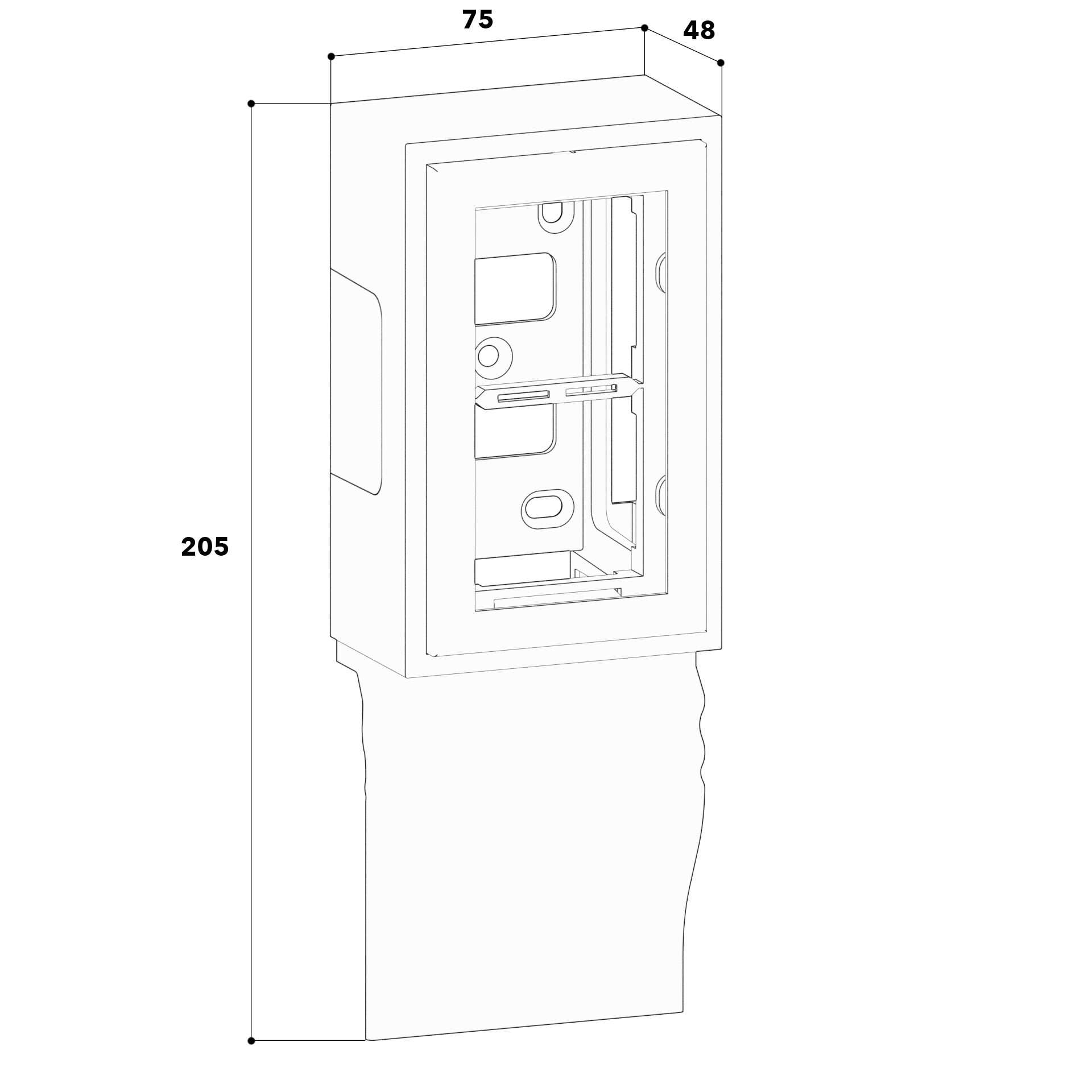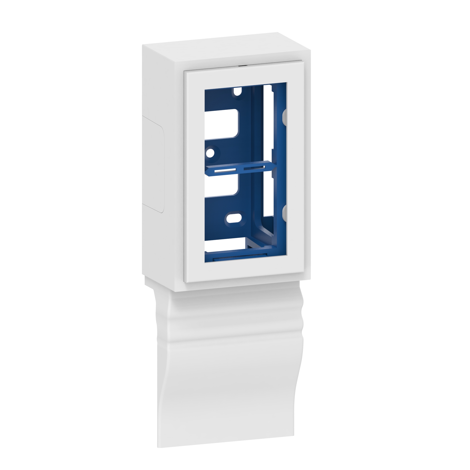 Appliance box for the 4D E skirting trunking "Belle epoque", for device installation of two compact M45 built-in devices in 45x45 mm format (e.g. socket, data socket, antenna socket, USB charging socket, switch), device support with transition cover to skirting and support profile including fixing material for screwing above the skirting trunking base. Special feature: Due to its vertical alignment, this device support can be mounted on the wall in places where space is limited (e.g. room niche, etc.). Note: The covers of the skirting trunking can be pushed sideways under the transition cover of the unit support, whereby the transition cover of the unit support performs a cut-covering function for the covers of the skirting trunking.