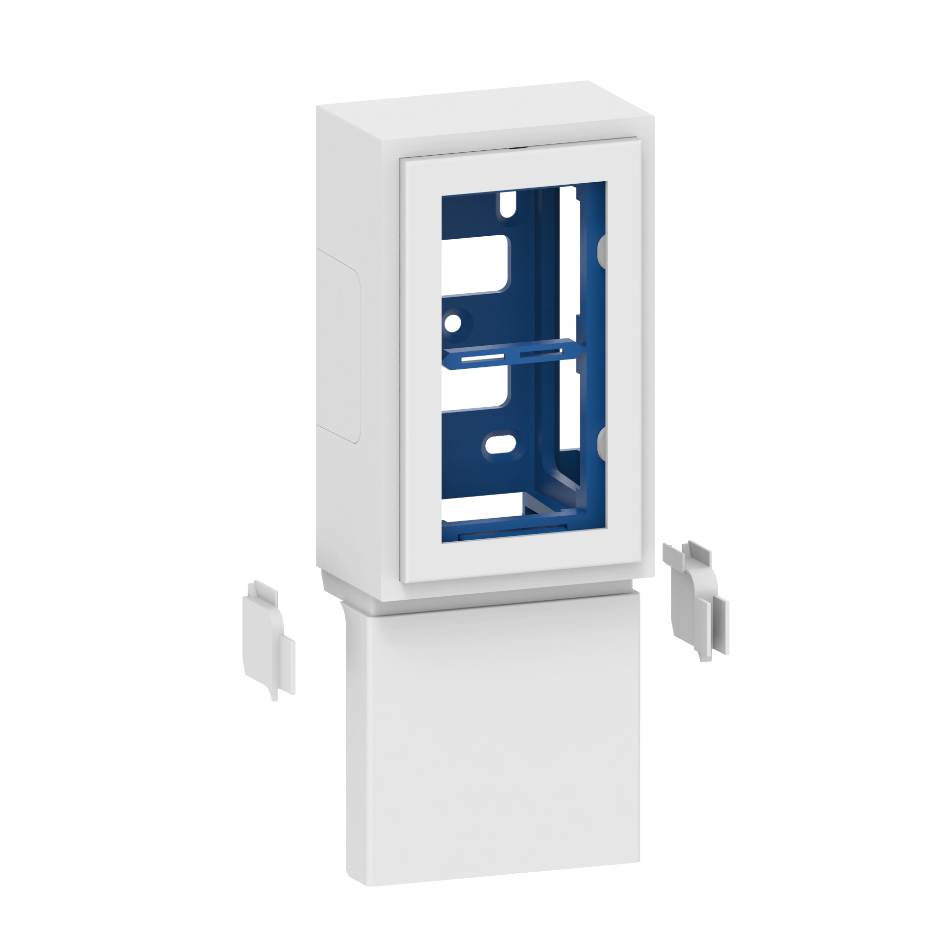 Appliance box for skirting trunking SL 20x50 and SL 20x70, for device installation of two compact M45 built-in devices in 45x45 mm format (e.g. socket outlet, data socket outlet, antenna socket outlet, USB charging socket outlet, switch), device support with transition cover to skirting and support profile including fixing material for screwing above the skirting trunking base. Note: The covers of the skirting trunking can be slid sideways under the transition cover of the device support, whereby the transition cover of the device support performs a cut-covering function for the covers of the skirting trunking.