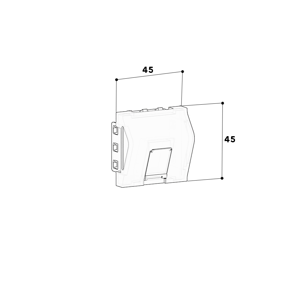 RJ45 connector unit with a modular Cat.6A data technology module, mounting form: Keystone, cable feed 270°, plug-in direction of the module angled approx. 30° downwards, with dust protection flaps, for installation in service poles with 45 mm top section and mounting frames/device mounts to accommodate compact M45 built-in devices, for vertical device installation.