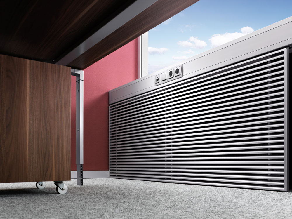 Louvre as accessory for sill cladding, design: slanted/inclined, height 20 mm, depth 20 mm, to be mounted with louvre support LT-5/125, louvre supports are placed on a previously mounted support profile. The ideal solution for elegantly concealing heating and air-conditioning units in rooms with window parapets and/or for combining an additionally required post-installation with a parapet duct without significantly impairing the air flow.