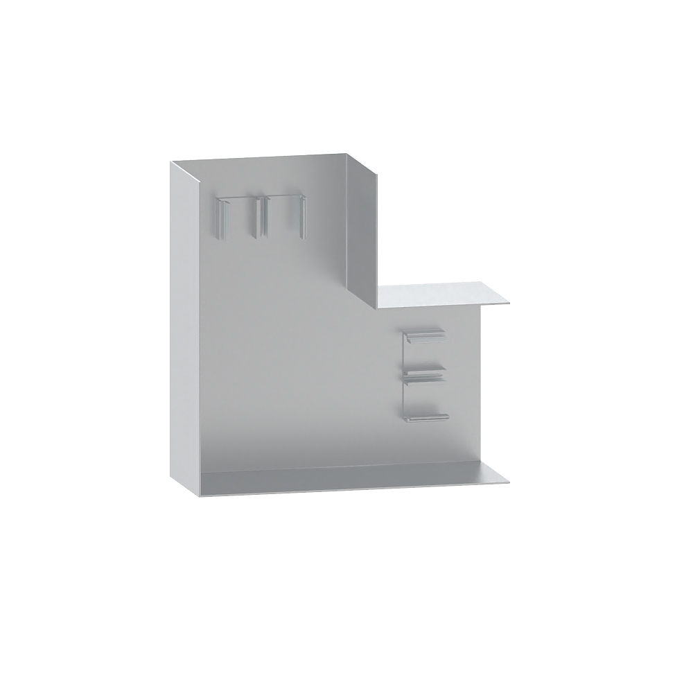 Flat angle as cut-laminating moulded hood for wall duct made of aluminium, for cable routing with a 90° change of direction on the wall.