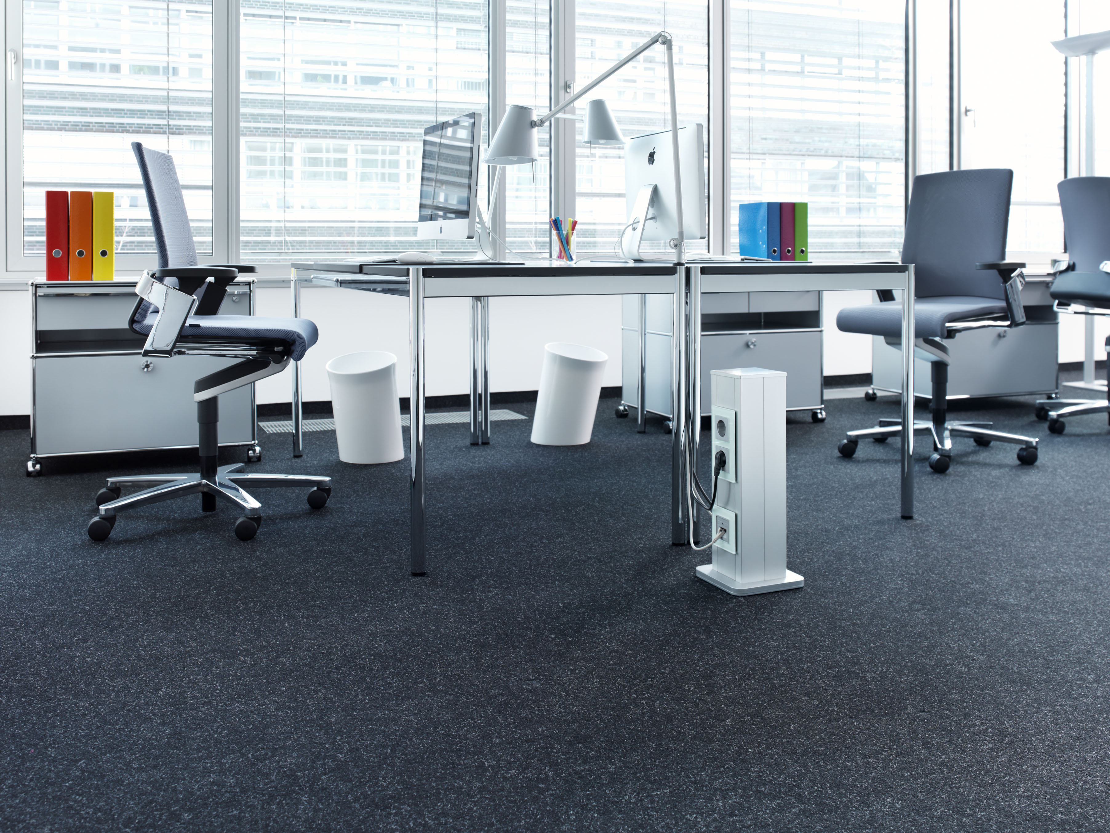 Floor/ceiling service pole of aluminium with two 76.5 mm wide fixing tracks for device installation of commercially available switch ranges in combination with accessory mounting boxes or M45 built-in devices with the aid of front-locking mounting frames, cable entry through the floor or via the ceiling, consisting of two bases with a DIN rail for snap-in mounting of a partition wall of plastic for separating cables and two covers as pole body (height 3. 000 mm), a permanently mountable base plate (width: 200 mm, depth: 200 mm, material thickness: 17 mm), a top plate for fastening the telescopic unit and a universal telescope for clamping fastening. Potential equalisation and earthing measures must be carried out professionally. The specified length corresponds to the length of the column body.