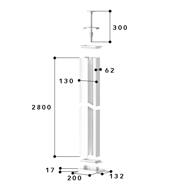Floor/ceiling powerpole made of aluminium with a 76.5 mm wide fixing track for device installation of commercially available switch ranges in combination with accessory mounting boxes or M45 built-in devices with the aid of front-locking installation frames, cable entry through the floor or via the ceiling, consisting of a base with a DIN rail for snap-in mounting of a partition wall made of plastic for separating cables and an cover as a pole body (height 2. 800 mm), a permanently mountable base plate (width: 200 mm, depth: 132 mm, material thickness: 17 mm), two 4-sided covering laminations for a clean transition from the base plate to the column body and from the column body to the ceiling, a top plate for mounting the telescopic unit and a universal telescope for tensioning. Potential equalisation and earthing measures must be carried out professionally. The specified length corresponds to the length of the column body.