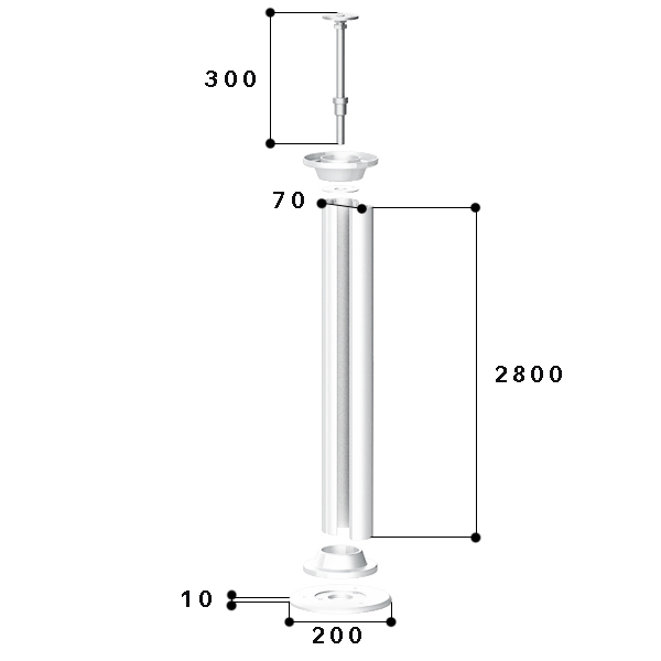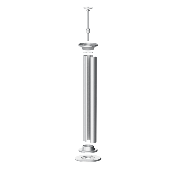 Floor/ceiling powerpole made of aluminium with a 45 mm wide fixing track for device installation of compact M45 built-in devices in 45x45 mm format, cable entry through the floor or via the ceiling, consisting of base and cover as pole body (height 2. 800 mm), two circular segment covers including fastening pins for closing the semicircular openings, a base plate that can be fixed in place (diameter: 200 mm, material thickness: 10 mm), two 360° circumferential laminations for a clean transition from the base plate to the column body and from the column body to the ceiling, a top plate for fastening the telescopic unit and a universal telescope for clamping fastening. Potential equalisation and earthing measures must be carried out professionally. The specified length corresponds to the length of the column body.