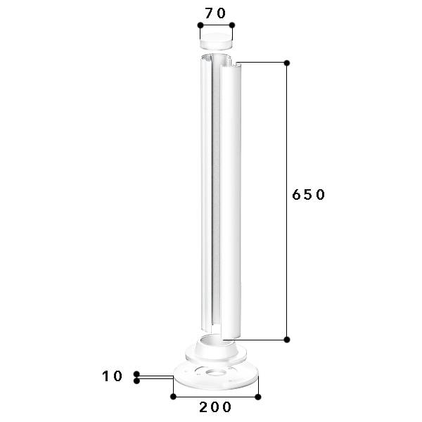 Powerpole made of aluminium with a 45 mm wide fixing track for device installation of compact M45 built-in devices in the 45x45 mm format, cable entry through the base, consisting of base and cover as pole body (height 650 mm), two circular segment covers including fixing pins for closing the semicircular openings, a fixed-mountable base plate (diameter: 200 mm, material thickness: 10 mm), a 360° all-round lamination for a clean transition from the base plate to the column body and an end cap for a clean finish. Note: Potential equalisation and earthing measures must be carried out professionally. The specified length corresponds to the length of the column body.