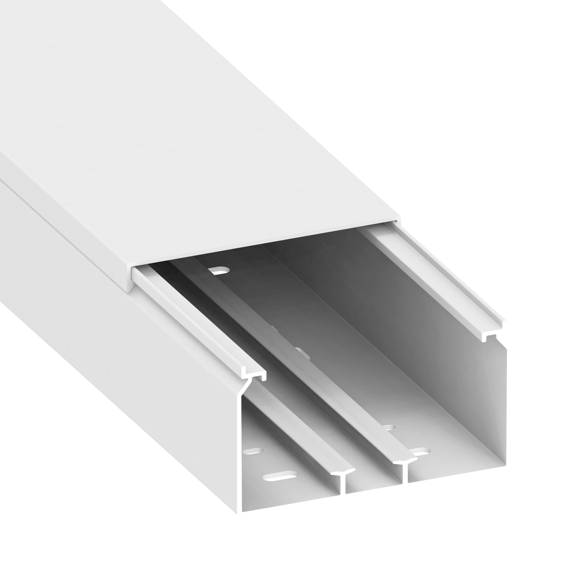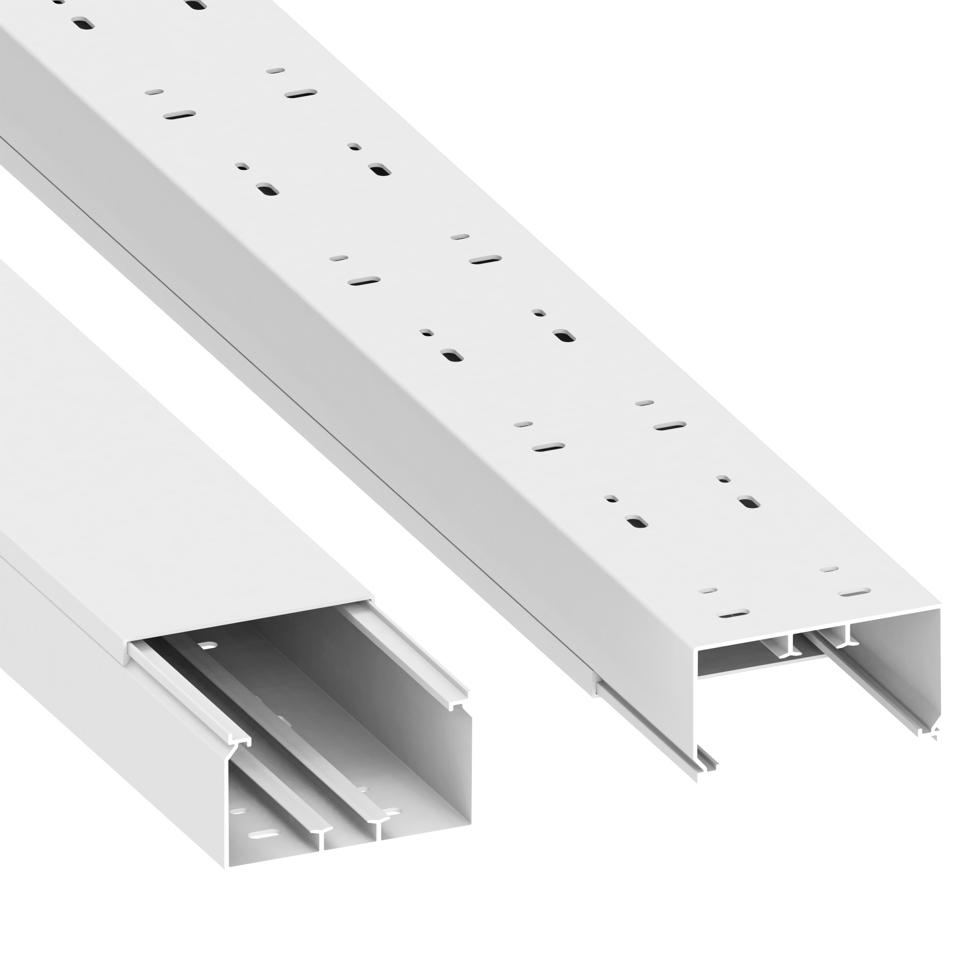 installation trunking made of PVC according to DIN EN 50085-2-1 for cable routing on walls and ceilings, consisting of a completely overlapping cover and base with double-row base perforation for fastening and a DIN rail for the installation of device installation boxes as well as partition walls, 4 cable retaining clips are included per 2 metre. Note: Sound and fire protection measures must be carried out professionally.