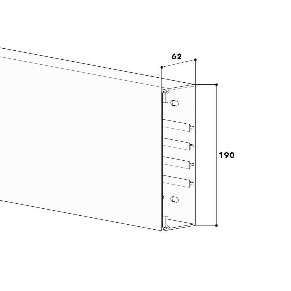PVC installation trunking according to DIN EN 50085-2-1 for cable routing on walls and ceilings, consisting of completely overlapping cover and base with double-row base perforation for fastening and two DIN rails for the installation of device installation boxes as well as snap-in partition walls, 4 freely movable cable clips are included per 2 metre. Note: Sound and fire protection measures must be carried out professionally.