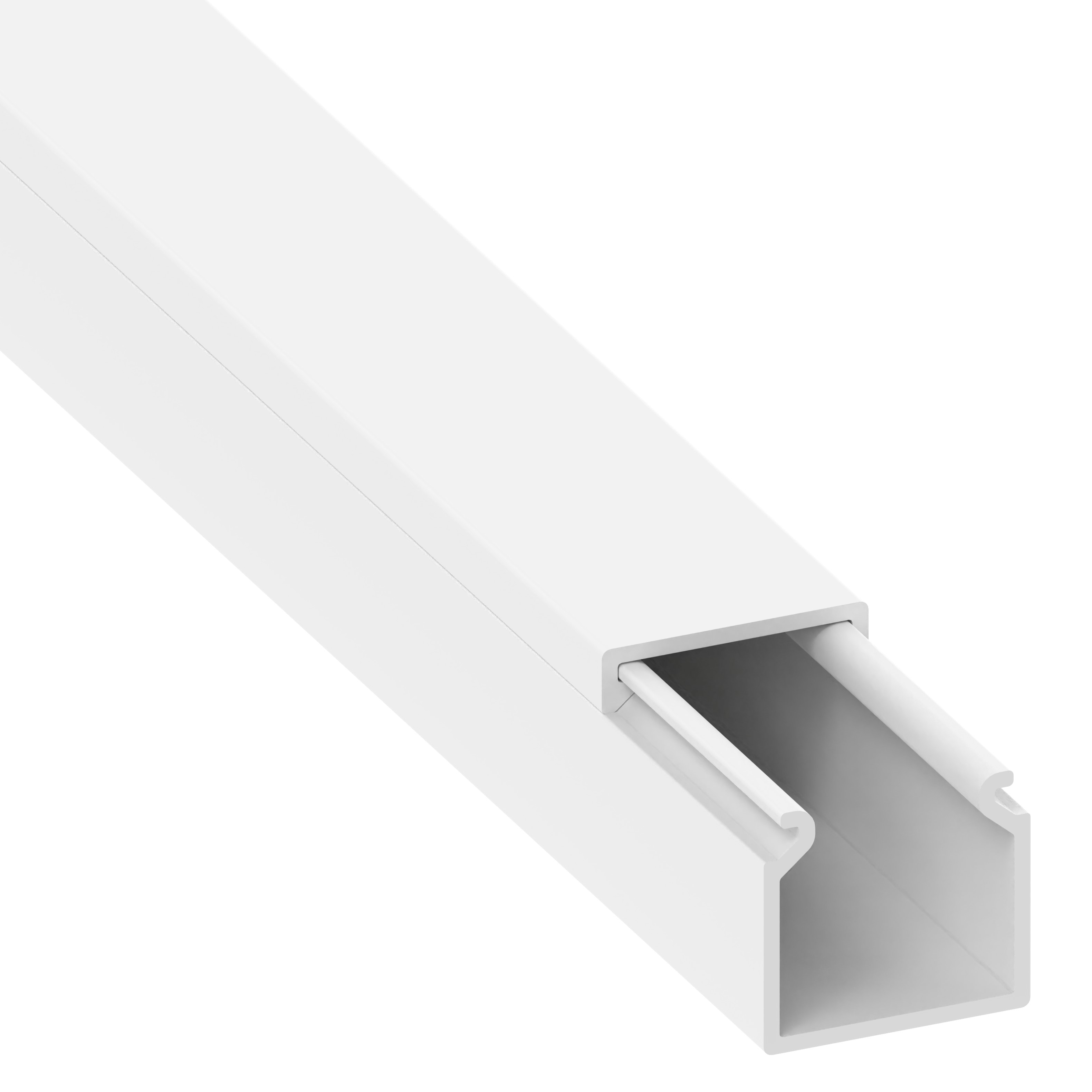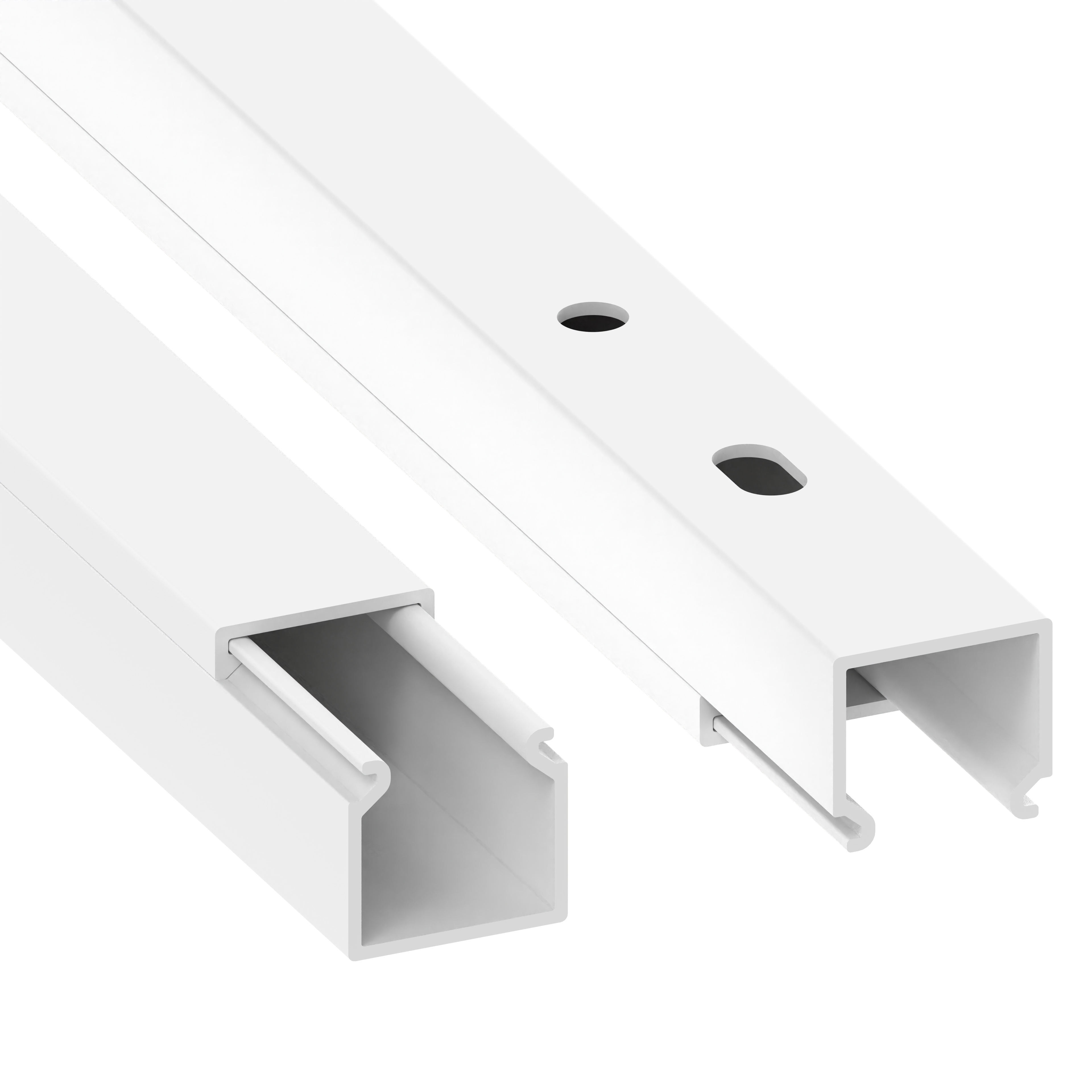 PVC installation trunking according to DIN EN 50085-2-1 for cable laying on walls and ceilings, consisting of a completely overlapping cover and base with single-row base perforation for fastening. Note: Sound and fire protection measures must be carried out professionally.
