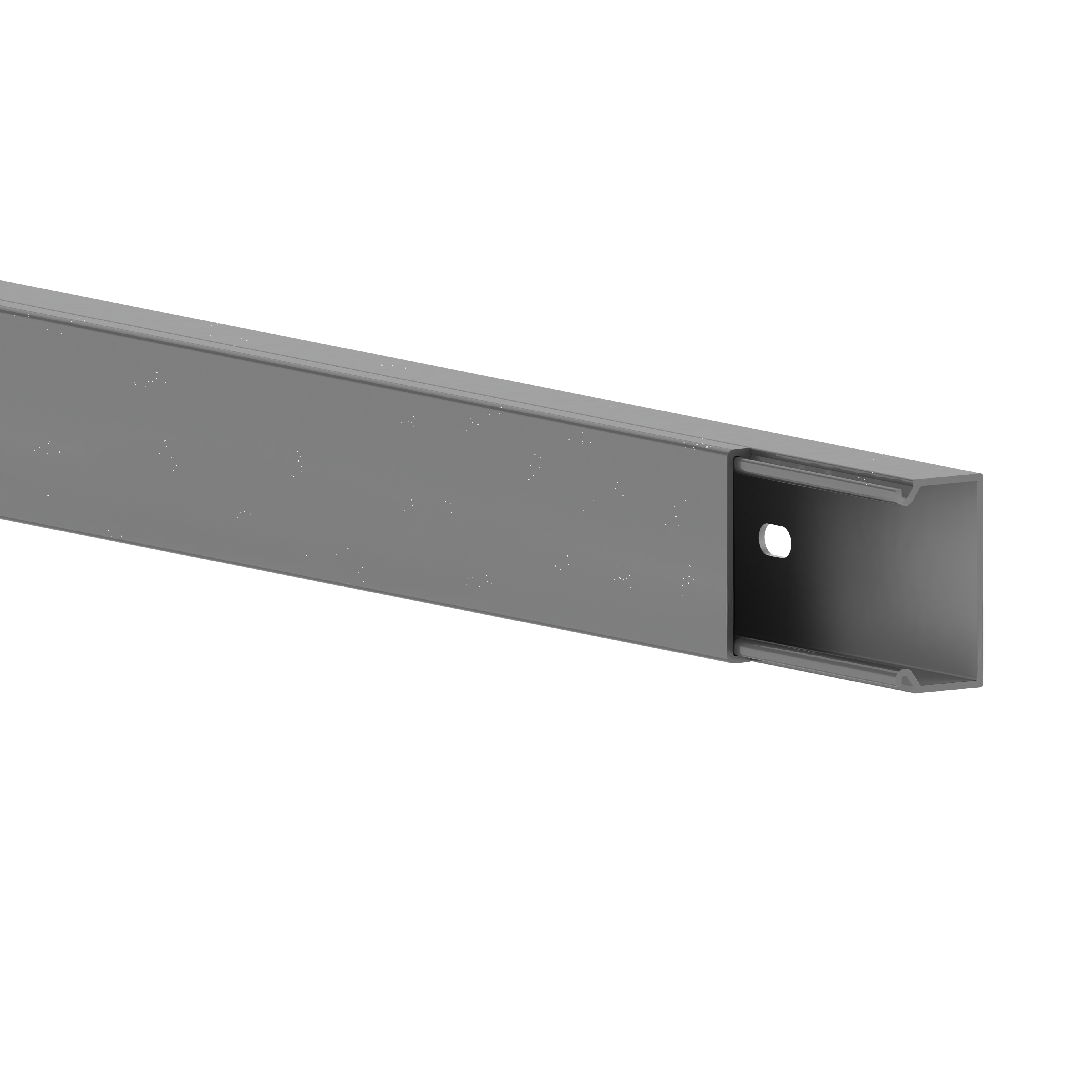 PVC installation trunking according to DIN EN 50085-2-1 for cable laying on walls and ceilings, consisting of a completely overlapping cover and base with single-row base perforation for fastening. Note: Sound and fire protection measures must be carried out professionally.