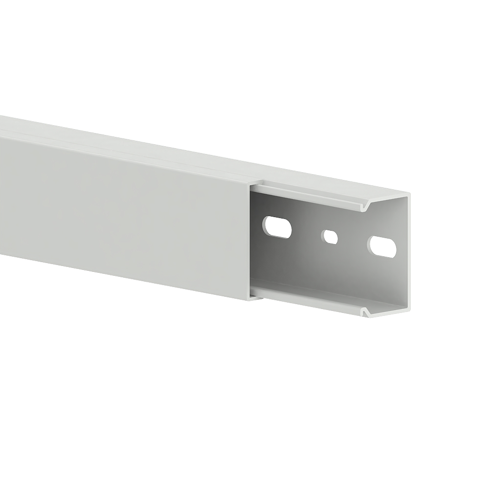 PVC installation trunking according to DIN EN 50085-2-1 for cable laying on walls and ceilings, consisting of a completely overlapping cover and base with single-row base perforation for fastening. Note: Sound and fire protection measures must be carried out professionally.