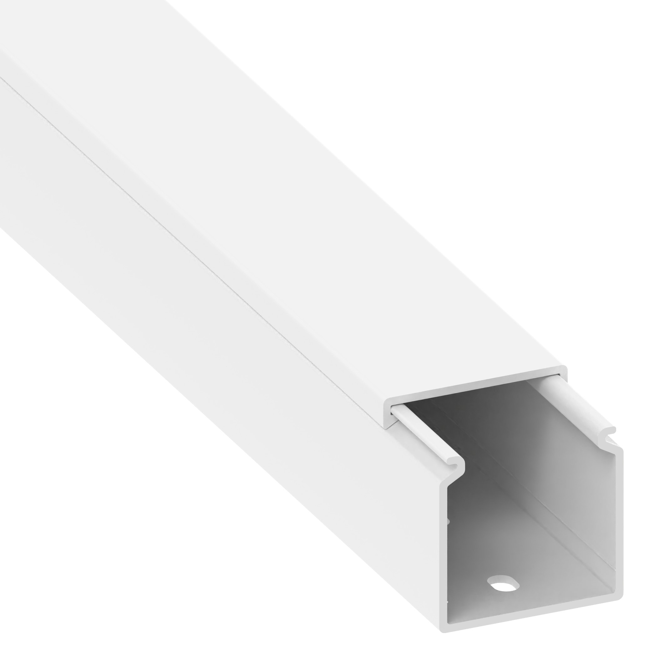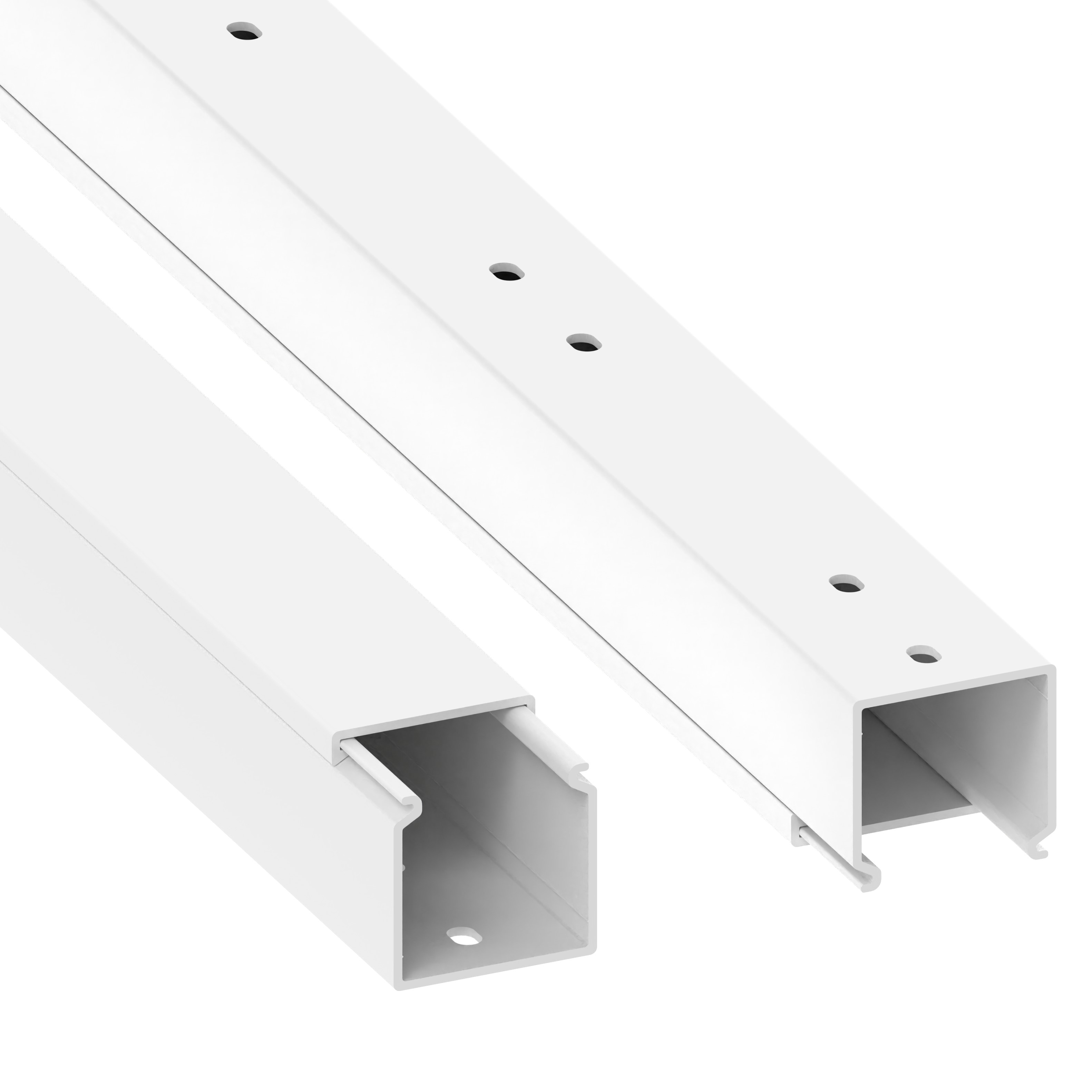 PVC installation trunking according to DIN EN 50085-2-1 for cable laying on walls and ceilings, consisting of a completely overlapping cover and base with single-row base perforation for fastening. Note: Sound and fire protection measures must be carried out professionally.