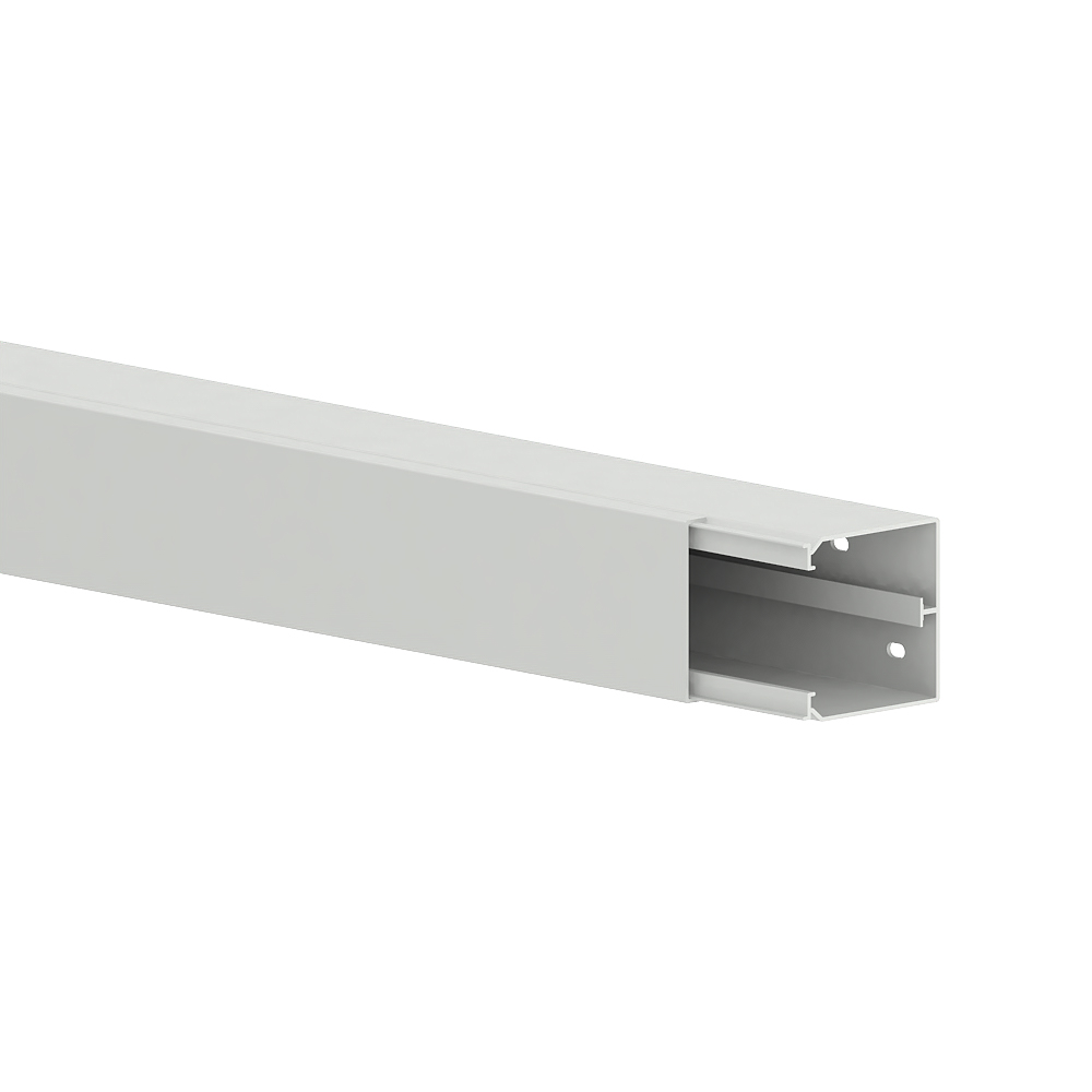 PVC installation trunking according to DIN EN 50085-2-1 for cable routing on walls and ceilings, consisting of a completely overlapping cover and base with double-row base perforation for fastening and a mounting rail for the installation of a snap-in partition, 4 freely movable cable holding clips are included per 2 metre. Note: Sound and fire protection measures must be carried out professionally.