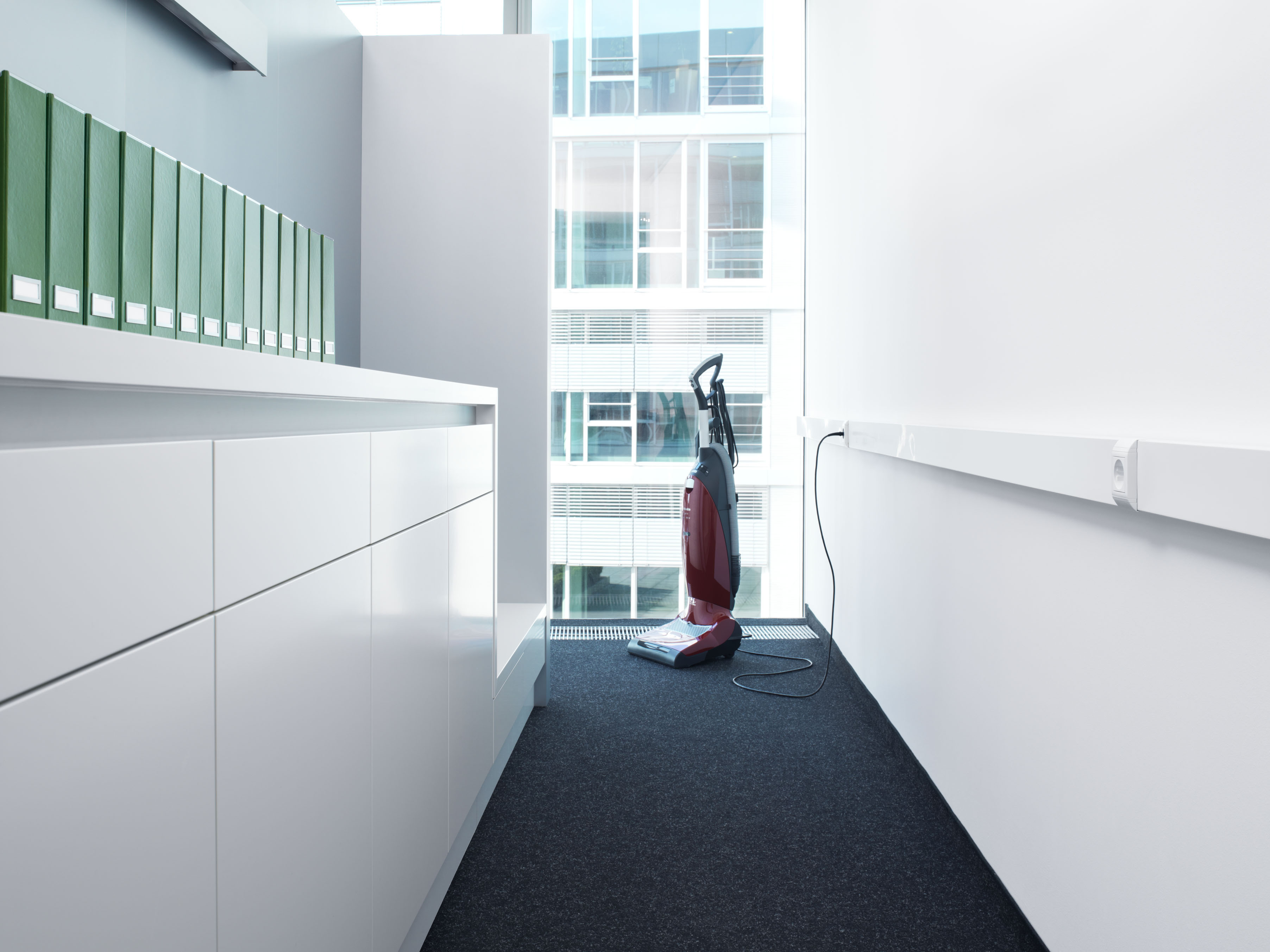 PVC installation trunking according to DIN EN 50085-2-1 for cable routing on walls and ceilings, consisting of a completely overlapping cover and base with double-row base perforation for fastening and a mounting rail for the installation of a snap-in partition, 4 freely movable cable clips are included per 2 metre. Note: Sound and fire protection measures must be carried out professionally.