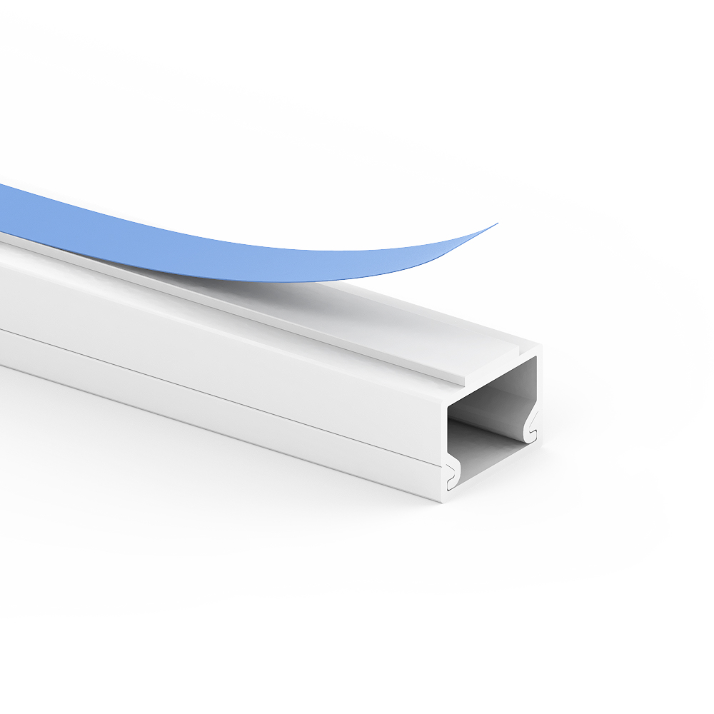 PVC cable duct according to DIN EN 50085-2-1 for cable laying on walls and ceilings, consisting of completely overlapping cover and base with double-sided adhesive foam tape for fastening. Note: For long-term use, we recommend nailing or screwing.