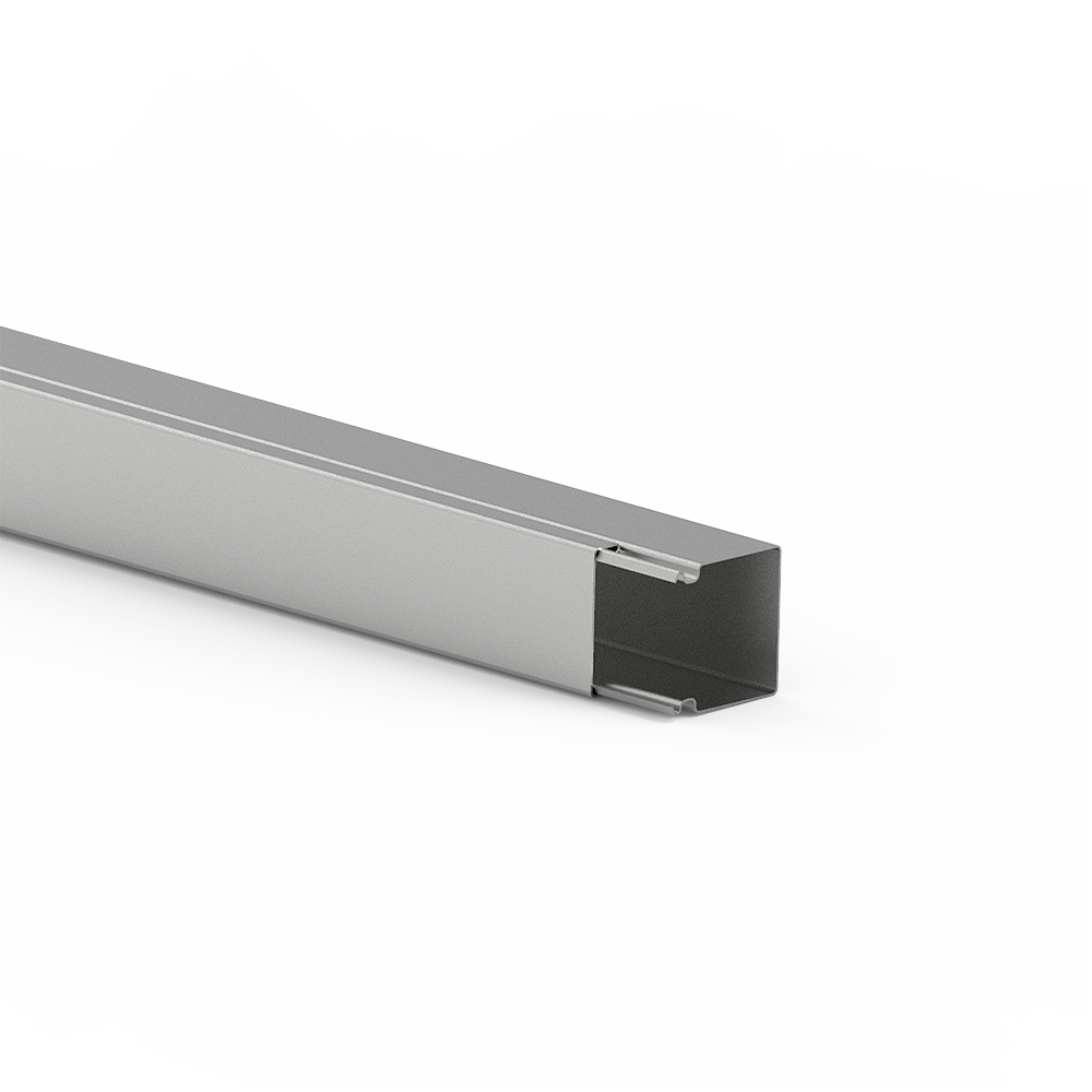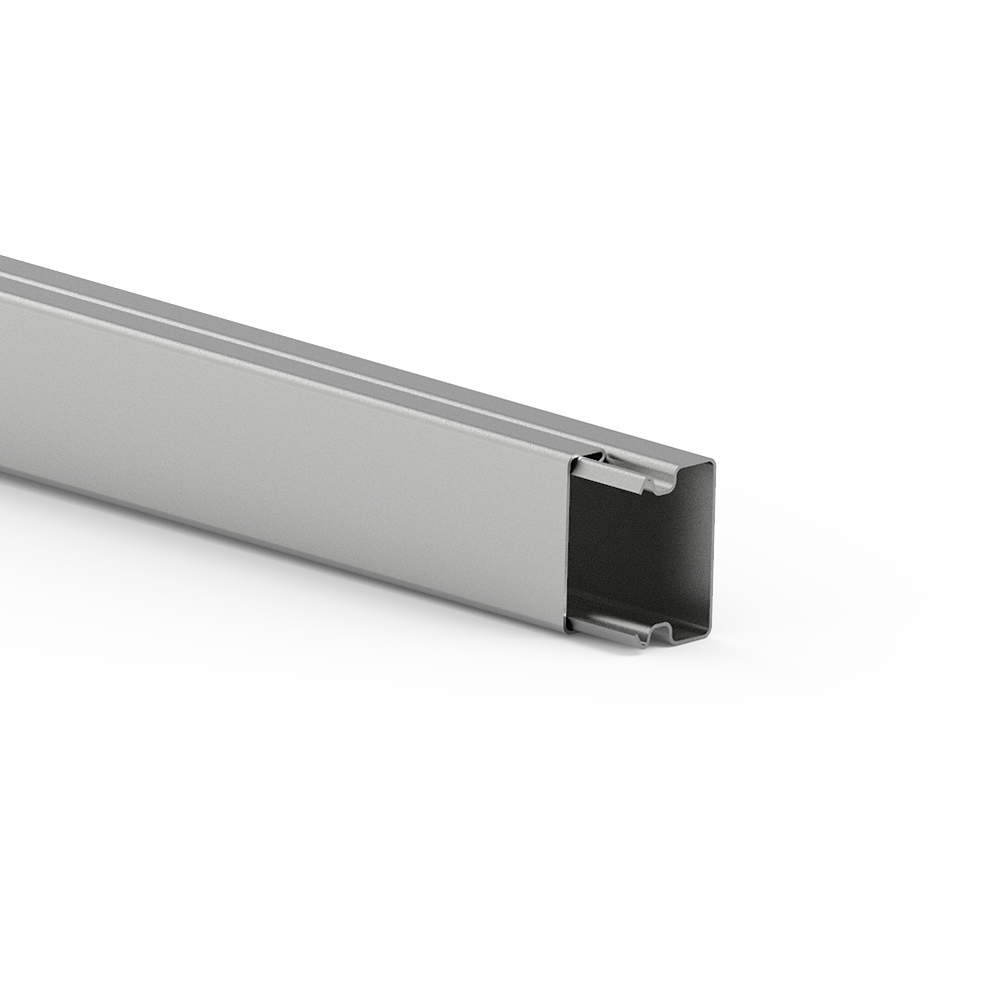 installation trunking made of sheet steel according to DIN EN 50085-2-1 for cable routing on walls and ceilings, consisting of completely overlapping cover and base with single-row base perforation for fastening. Note: Potential equalisation, earthing, sound and fire protection measures must be carried out professionally.