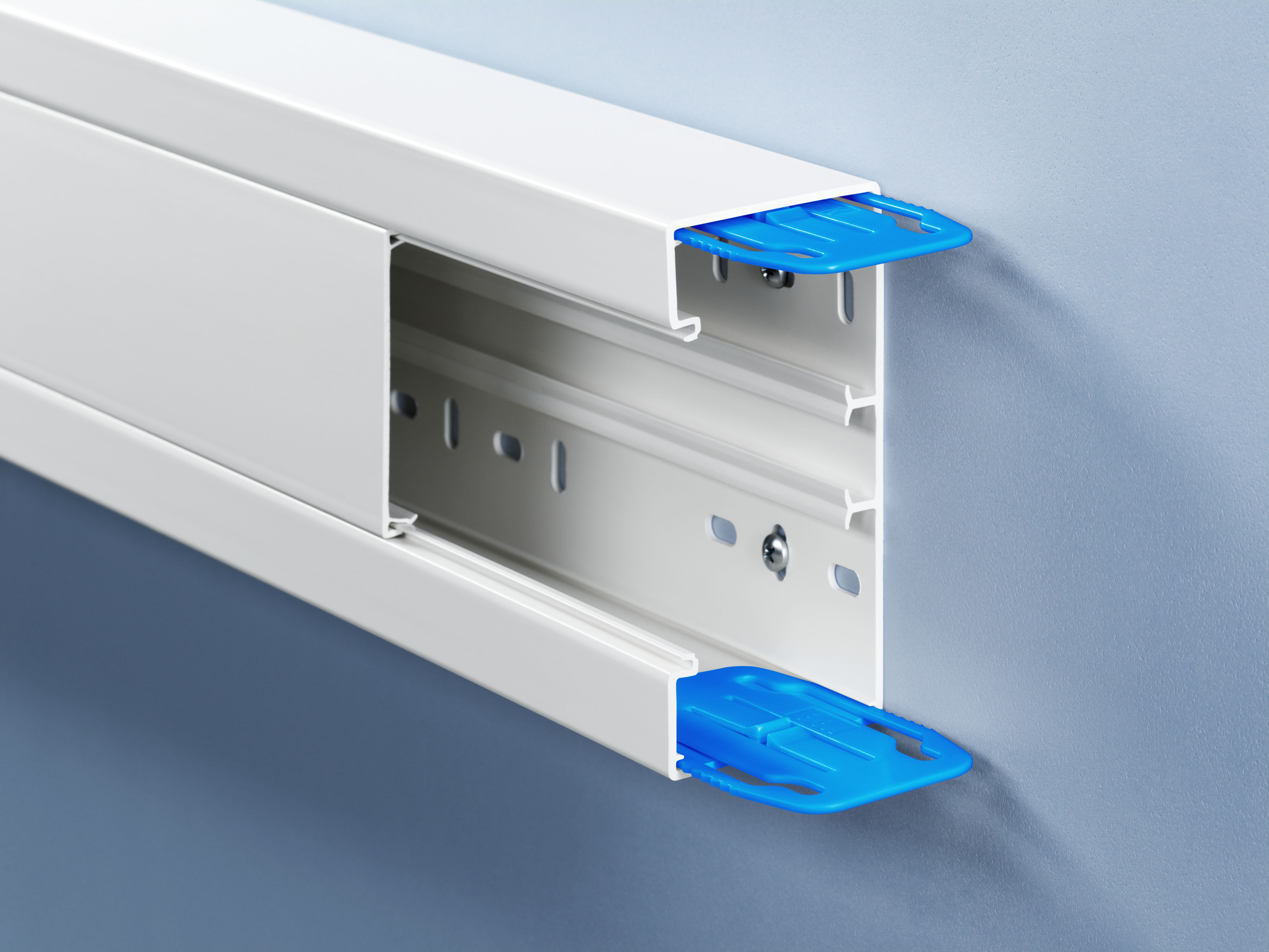 Coupling made of plastic as an assembly aid and for mechanical connection of two wall trunking bases, with a spring mechanism for engagement.