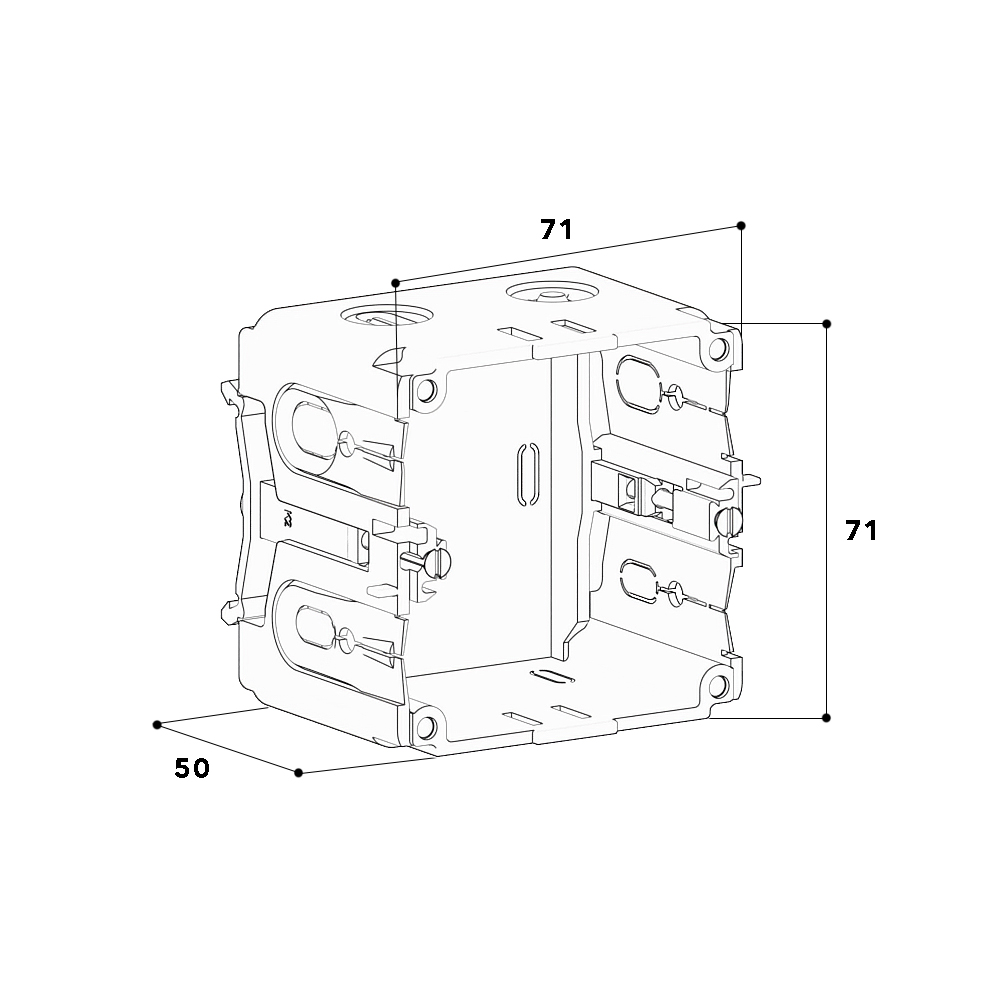 Halogen-free flush-mounting box for accommodating a commercially available device unit from the standard switch range, with strain-relief feed openings for cable diameters of 7-11mm and 11-13mm, for installation in wall trunking and installation trunking with a DIN rail and a height of 60 mm.