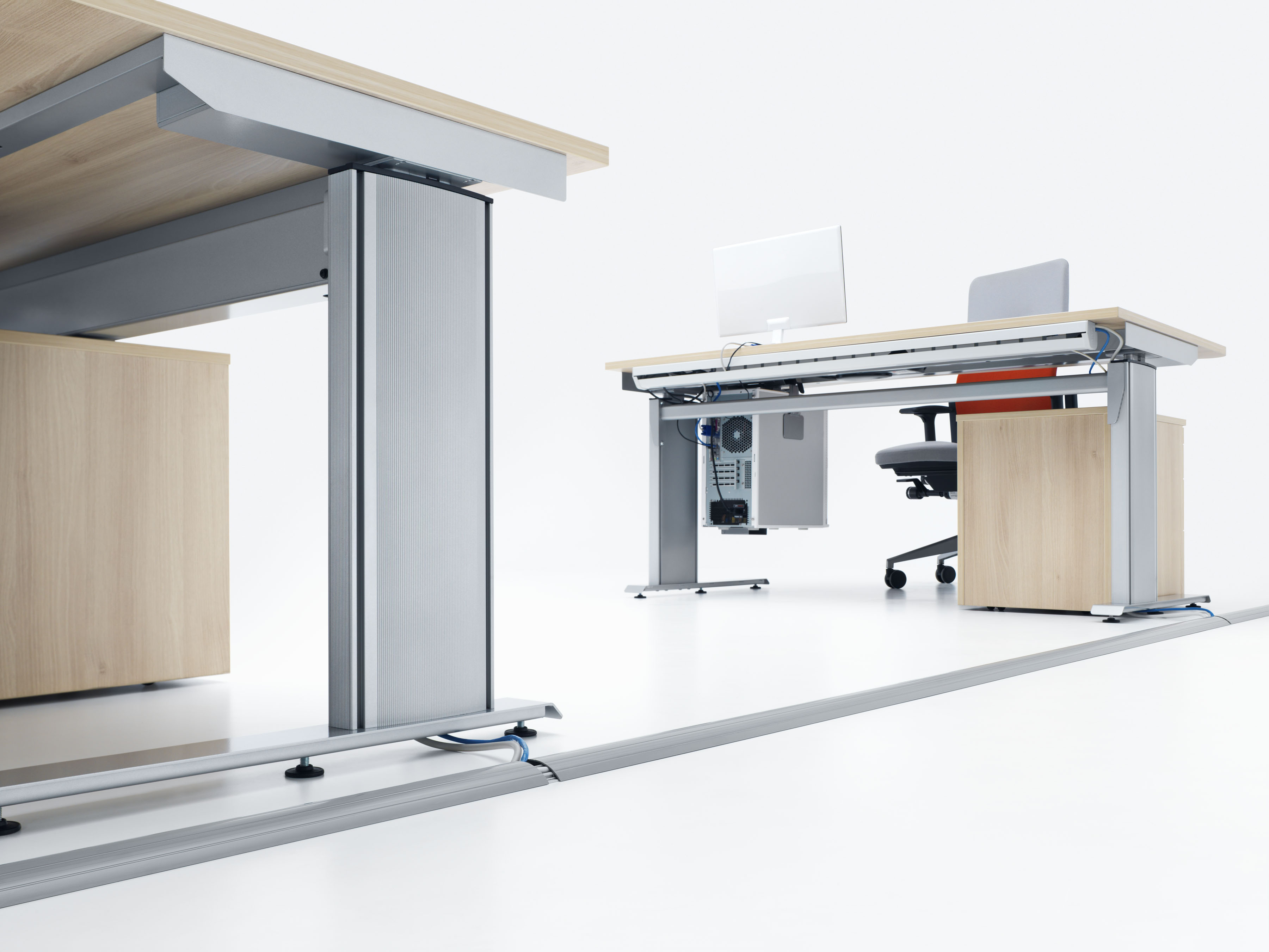 On-floor installation duct made of PVC according to DIN EN 50085-2-2 for the protection of cables and to avoid tripping hazards caused by cables lying on the floor, consisting of a base with three separate chambers and an overlapping cover with a fluted surface structure that is less sensitive to scratches. The profile can be walked on as well as stepped on and can withstand vertical loads of ~ 102 kg (1000 N). Note: The colour of the bases may vary due to production.