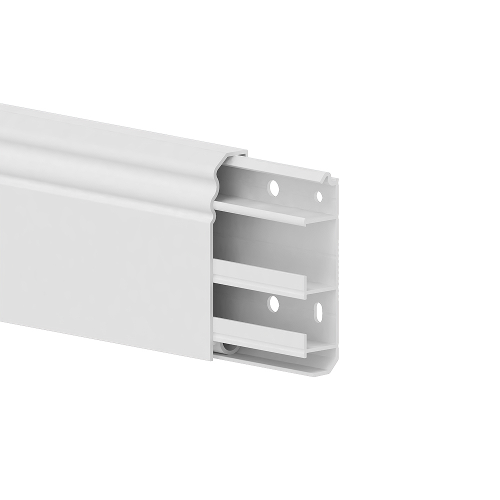 External corner as moulded part for 4D E skirting trunking "Belle epoque", for laying cables around wall projections and wall openings indoors, cable-securing base with locking cover.