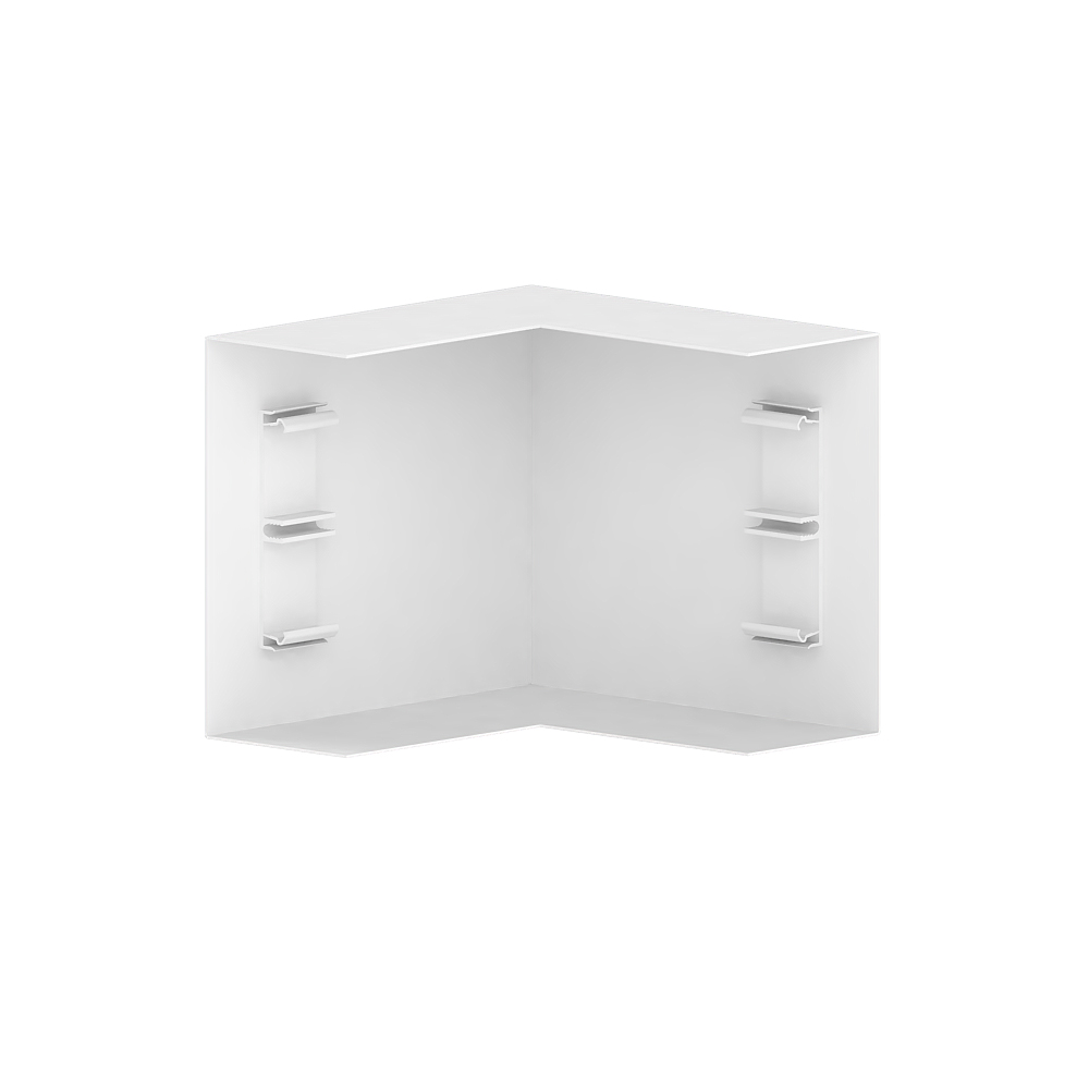 Outer corner as cut-covering moulded hood for wall duct made of aluminium and sheet steel, for routing cables around wall projections, with pre-assembled cover for plugging into the base, side length 150 mm.