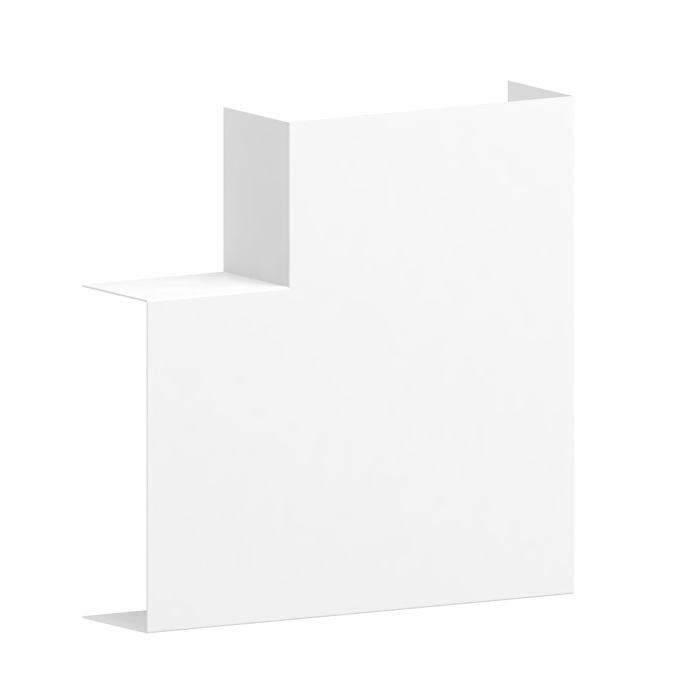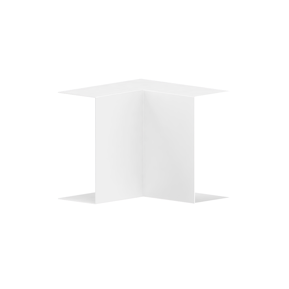 Outer corner as cut-covering moulded hood for wall duct made of aluminium and sheet steel, for routing cables around wall projections, with pre-assembled cover for plugging into the base, side length 150 mm.