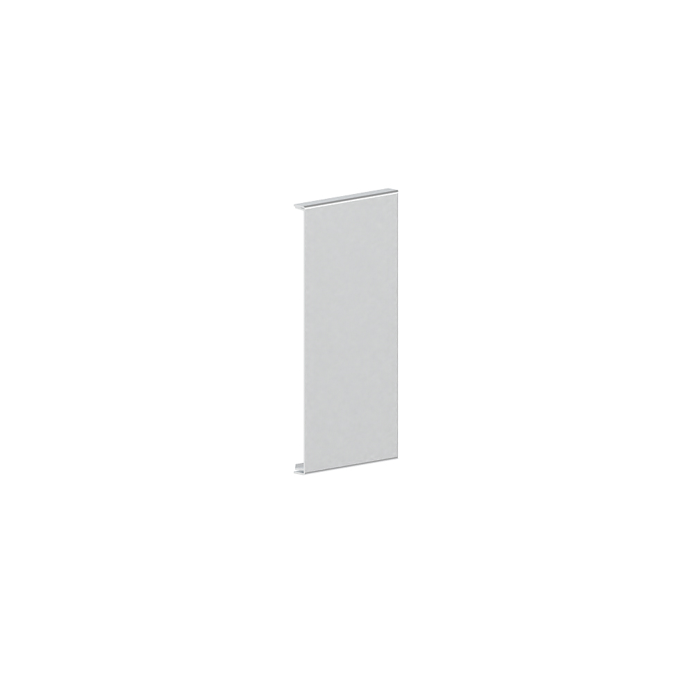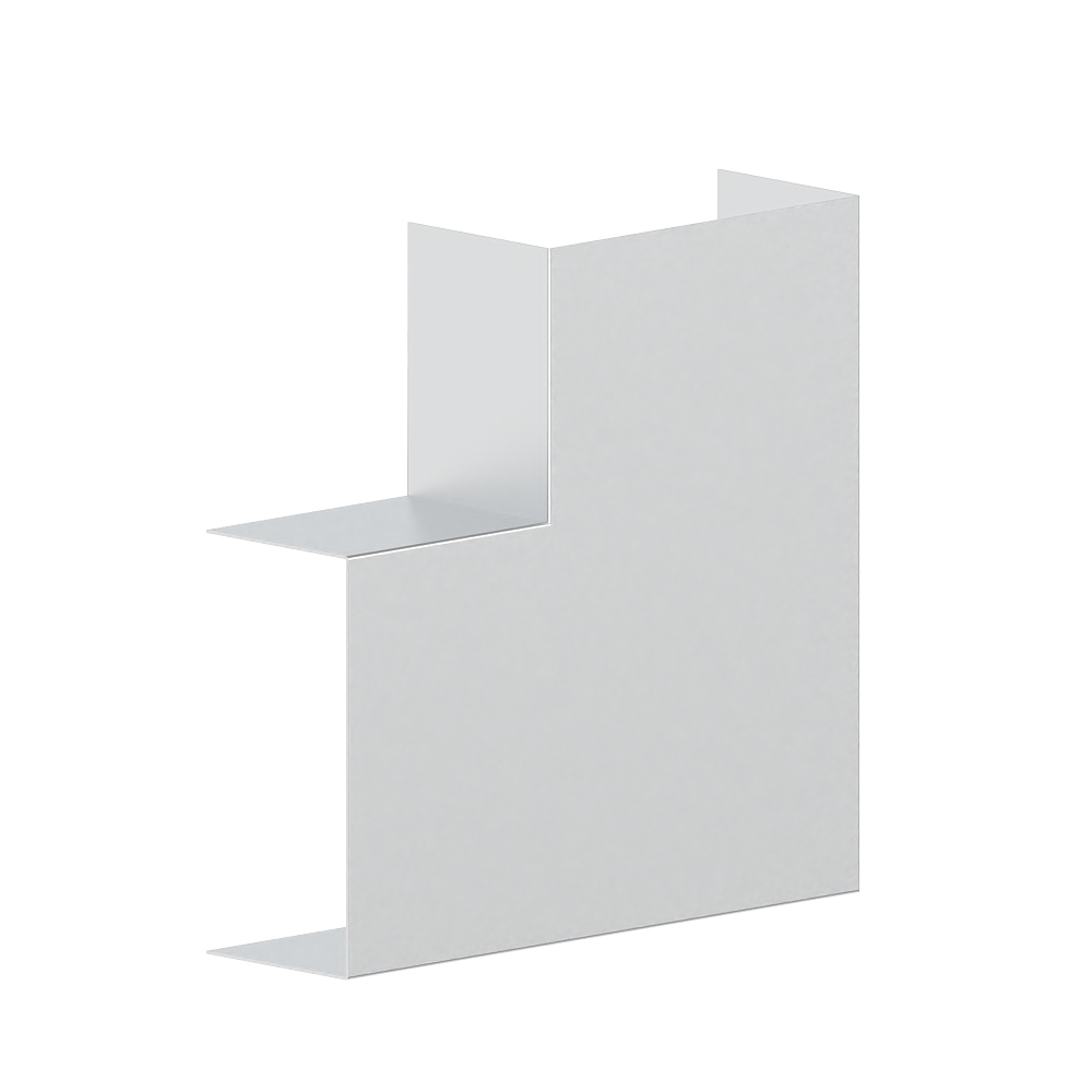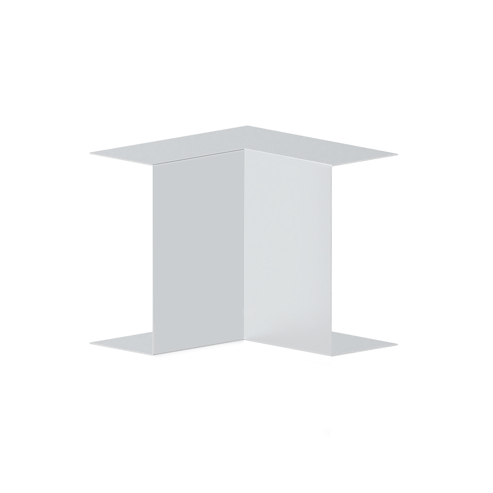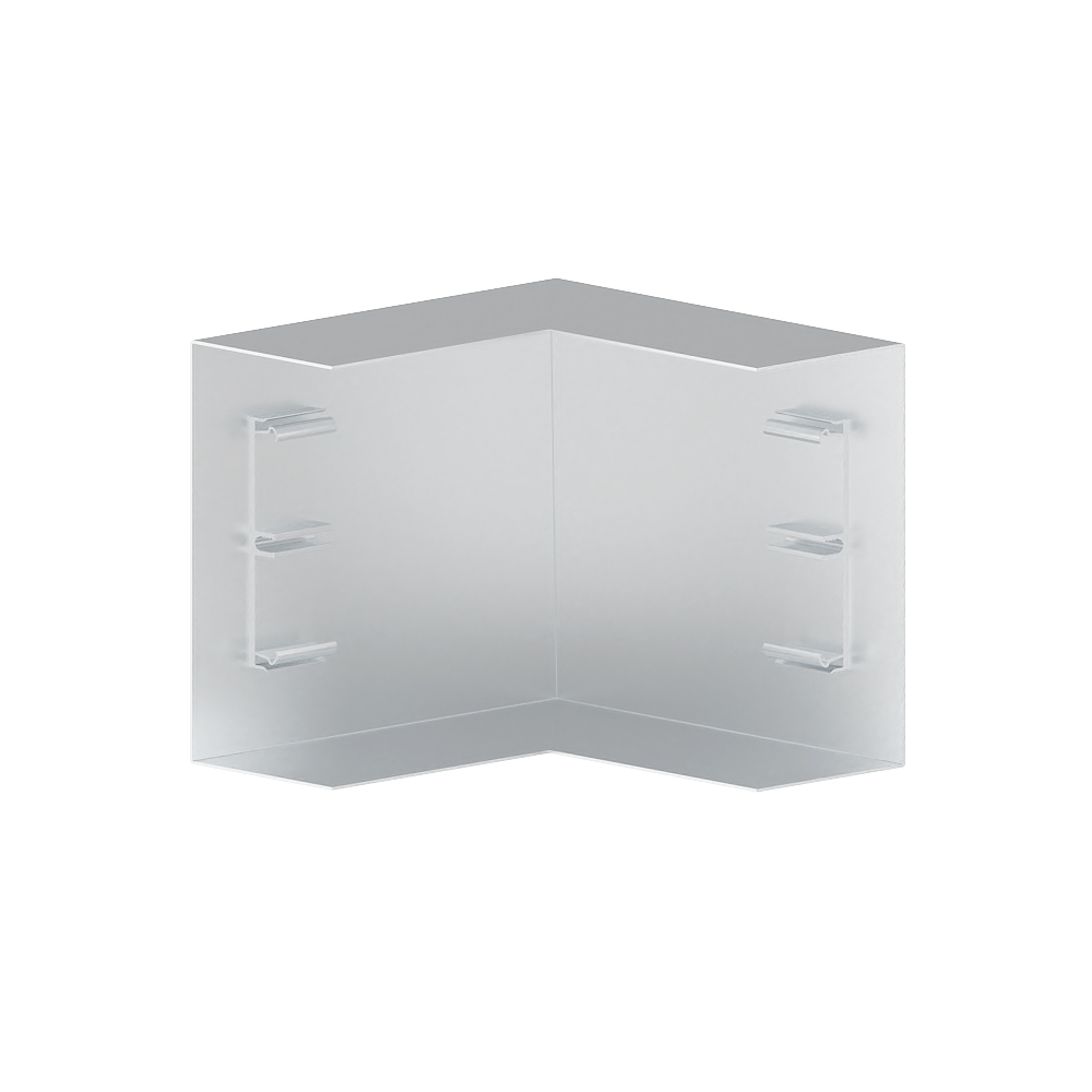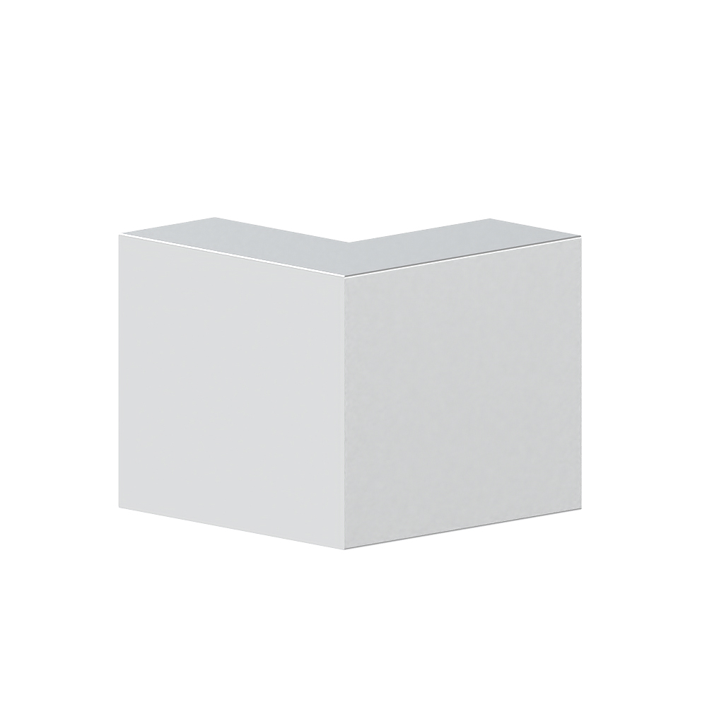 Outer corner as cut-covering moulded hood for aluminium wall trunking, for routing cables around wall projections, with pre-assembled cover for plugging into the bases, side length 150 mm.