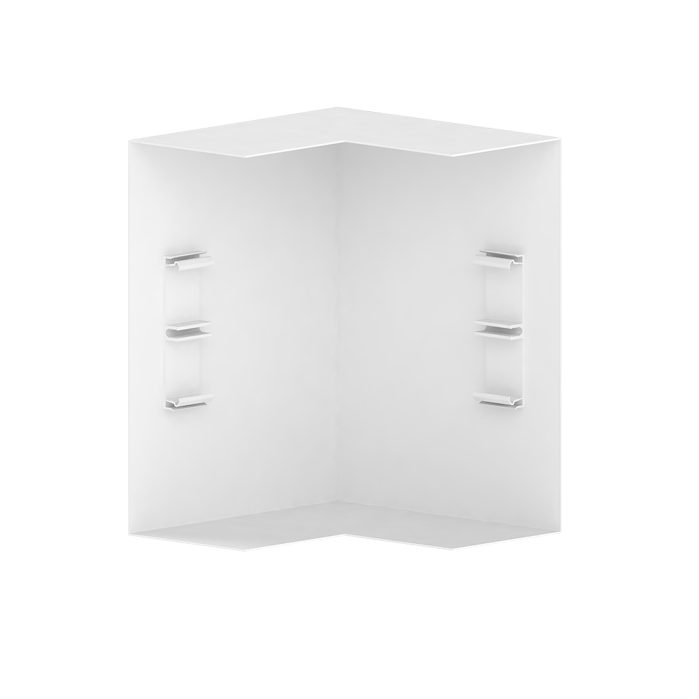 Outer corner as cut-covering moulded hood for wall duct made of sheet steel, for routing cables around wall projections, with pre-assembled cover for plugging into the bases, side length 170 mm.