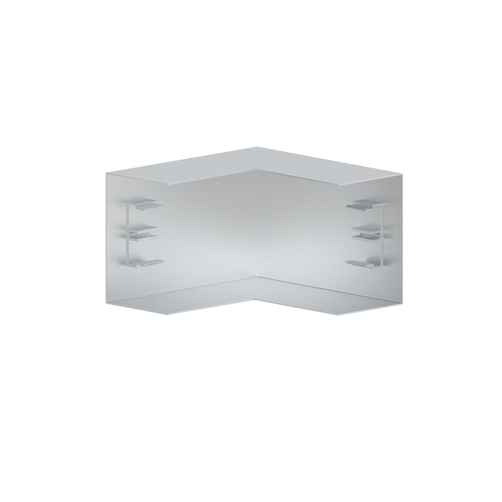 Outer corner as cut-covering moulded hood for wall duct made of aluminium, for routing cables around wall projections, with pre-assembled cover for plugging into the bases.
