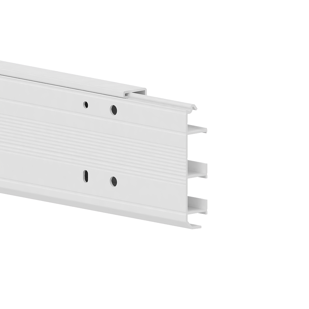 E skirting trunking made of PVC according to DIN EN 50085-2-1 for cable laying on the wall, consisting of a base with double-row floor perforation for screwing and three separate chambers for cable laying/separation as well as a completely overlapping cover for snapping onto the base. The distance from the floor to the first occupancy chamber is 11 mm and thus fulfils the minimum distance to the floor according to DIN EN 50085-2-1.