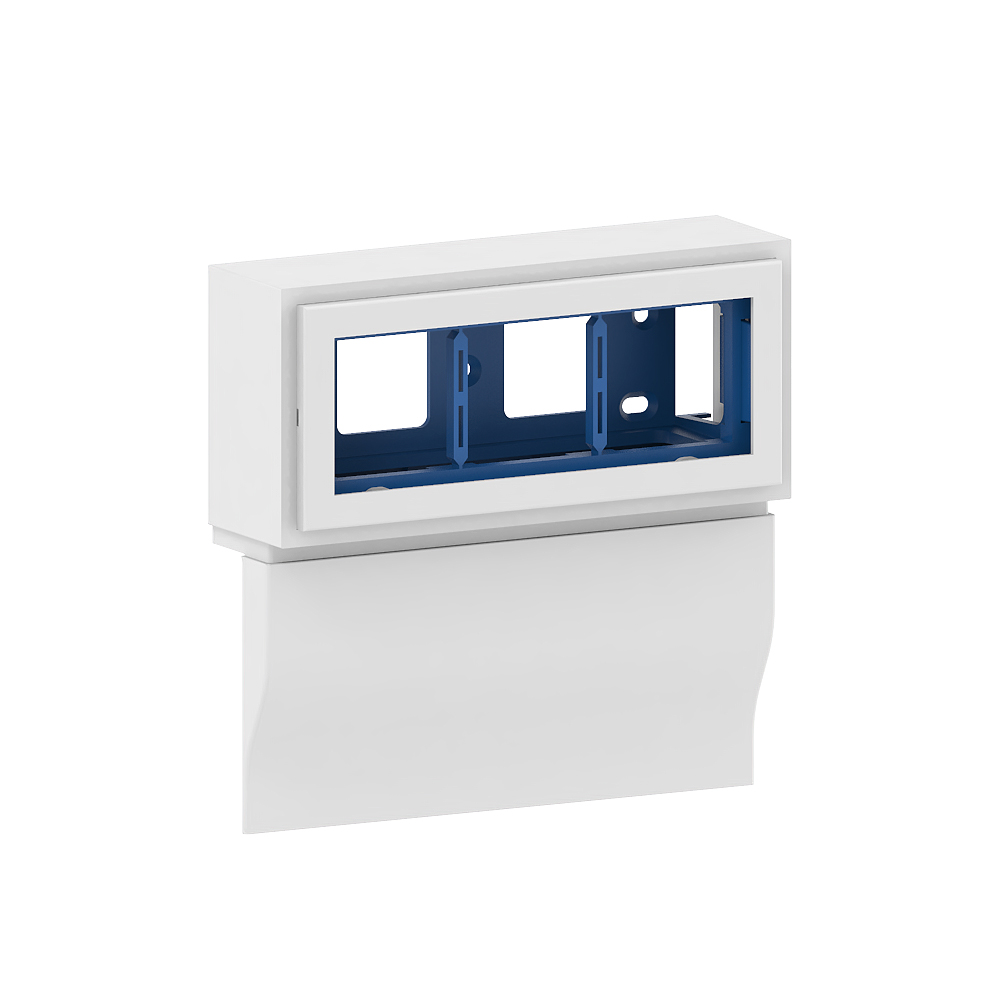 E skirting trunking made of PVC according to DIN EN 50085-2-1 for cable laying on the wall, consisting of a base with double-row floor perforation for screwing and three separate chambers for cable laying/separation as well as a completely overlapping cover for snapping onto the base. The distance from the floor to the first occupancy chamber is 11 mm and thus fulfils the minimum distance to the floor according to DIN EN 50085-2-1.