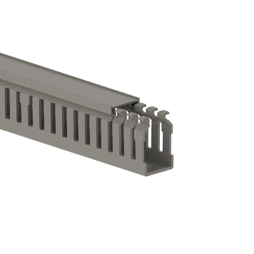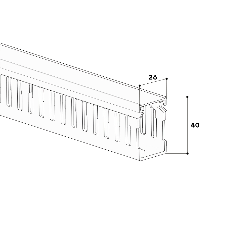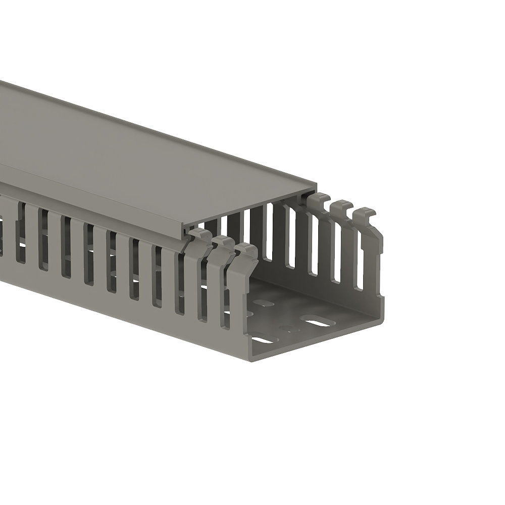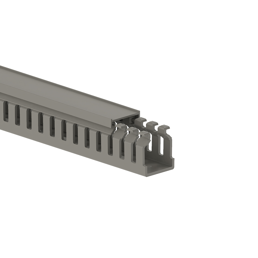 Slotted cable trunking made of PVC according to DIN EN 50085-2-3 for installation in switch cabinets, base with slotted side walls and with single-row base perforation according to DIN EN 50085-2-3, overlapping cover with a continuous labelling edge. The side bars can be broken out without tools, with the aid of notching pliers the side bars can be broken out down to the base. The wiring duct is VDE-tested and CSA-certified.