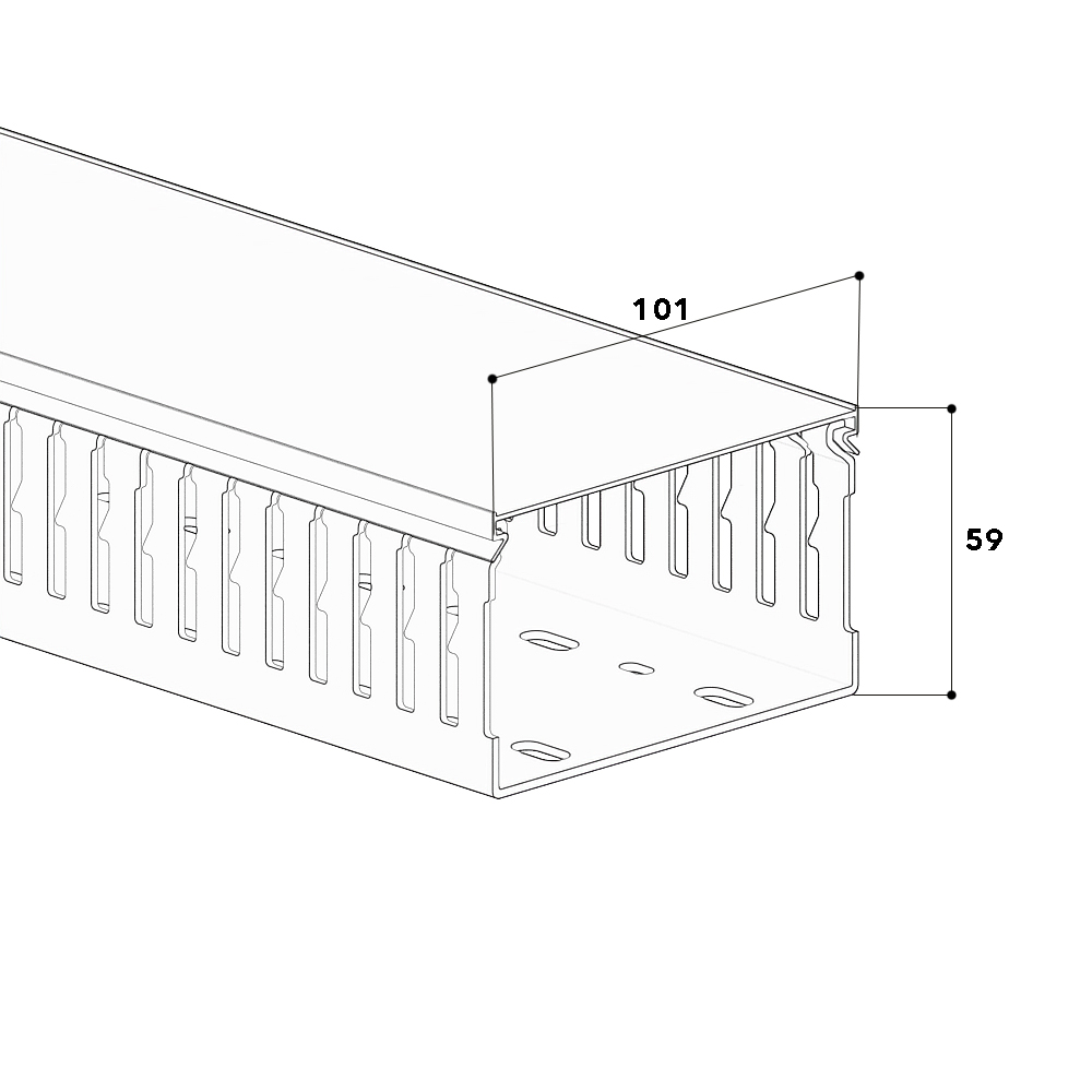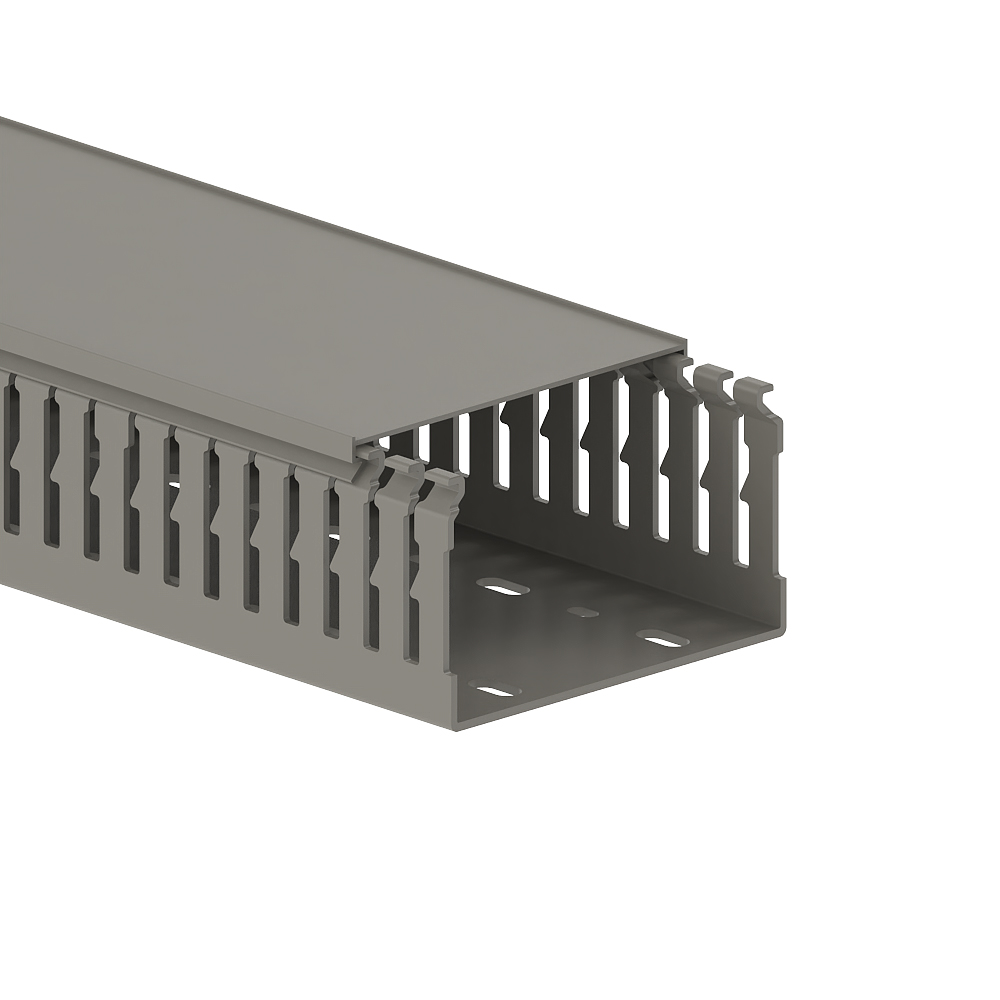 Slotted cable trunking made of PVC according to DIN EN 50085-2-3 for installation in switch cabinets, base with slotted side walls and with double-row base perforation according to DIN EN 50085-2-3, overlapping cover with a continuous labelling edge. The side bars can be broken out without tools, with the aid of notching pliers the side bars can be broken out down to the base. The wiring duct is VDE-tested and CSA-certified.