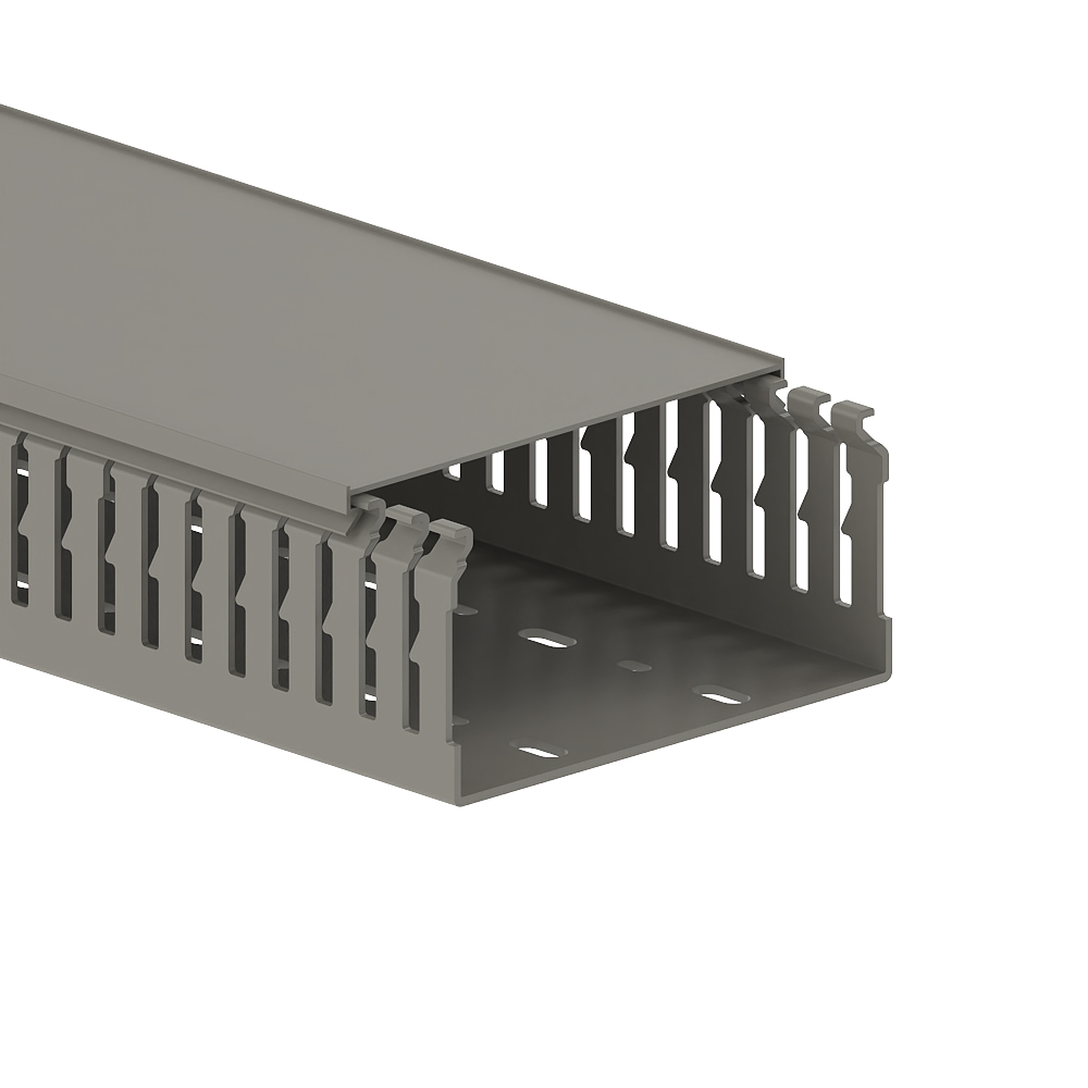 Slotted cable trunking made of PVC according to DIN EN 50085-2-3 for installation in switch cabinets, base with slotted side walls and with double-row base perforation according to DIN EN 50085-2-3, overlapping cover with a continuous labelling edge. The side bars can be broken out without tools, with the aid of notching pliers the side bars can be broken out down to the base. The wiring duct is VDE-tested and CSA-certified.