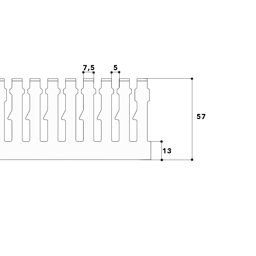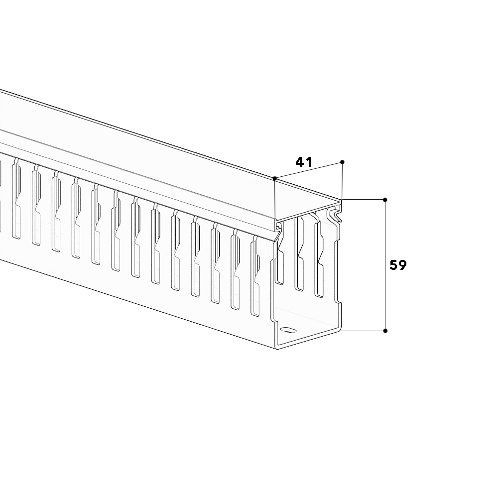 Slotted cable trunking made of PVC according to DIN EN 50085-2-3 for installation in switch cabinets, base with slotted side walls and with single-row base perforation according to DIN EN 50085-2-3, overlapping cover with a continuous labelling edge. The side bars can be broken out without tools, with the aid of notching pliers the side bars can be broken out down to the base. The wiring duct is VDE-tested and CSA-certified.