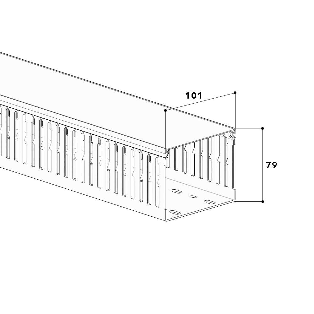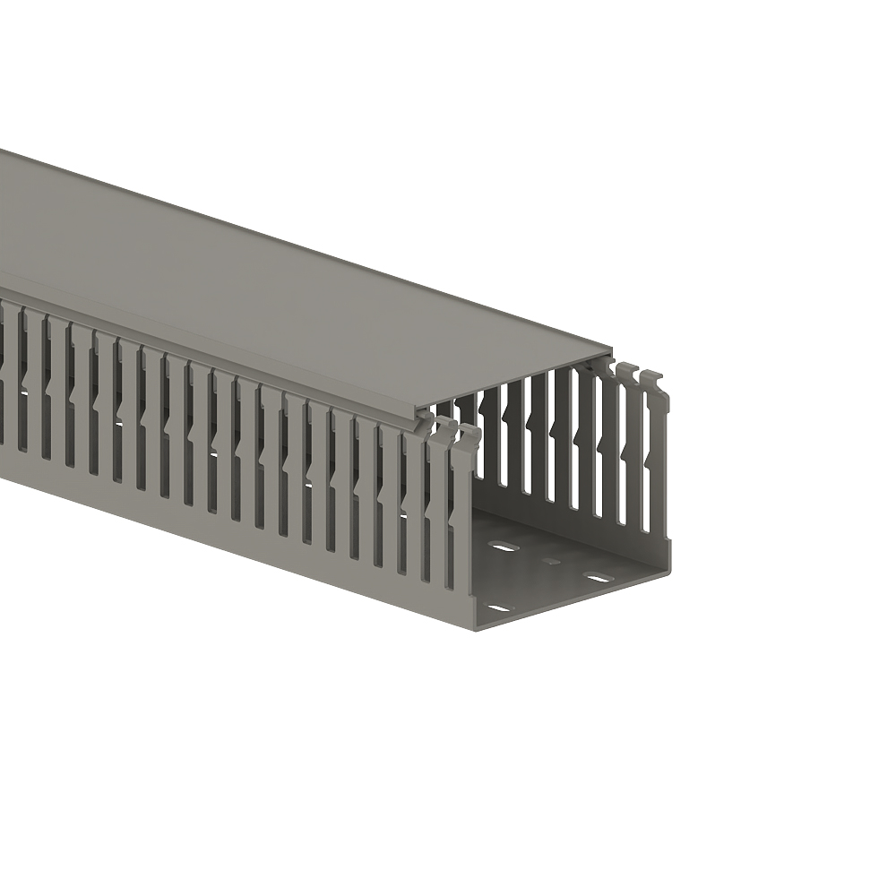 Slotted cable trunking made of PVC according to DIN EN 50085-2-3 for installation in switch cabinets, base with slotted side walls and with double-row base perforation according to DIN EN 50085-2-3, overlapping cover with a continuous labelling edge. The side bars can be broken out without tools, with the aid of notching pliers the side bars can be broken out down to the base. The wiring duct is VDE-tested and CSA-certified.