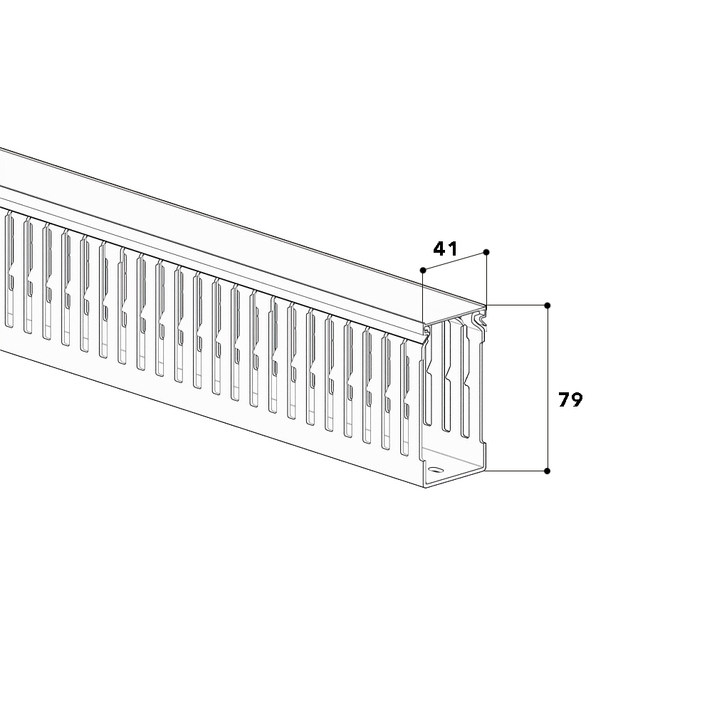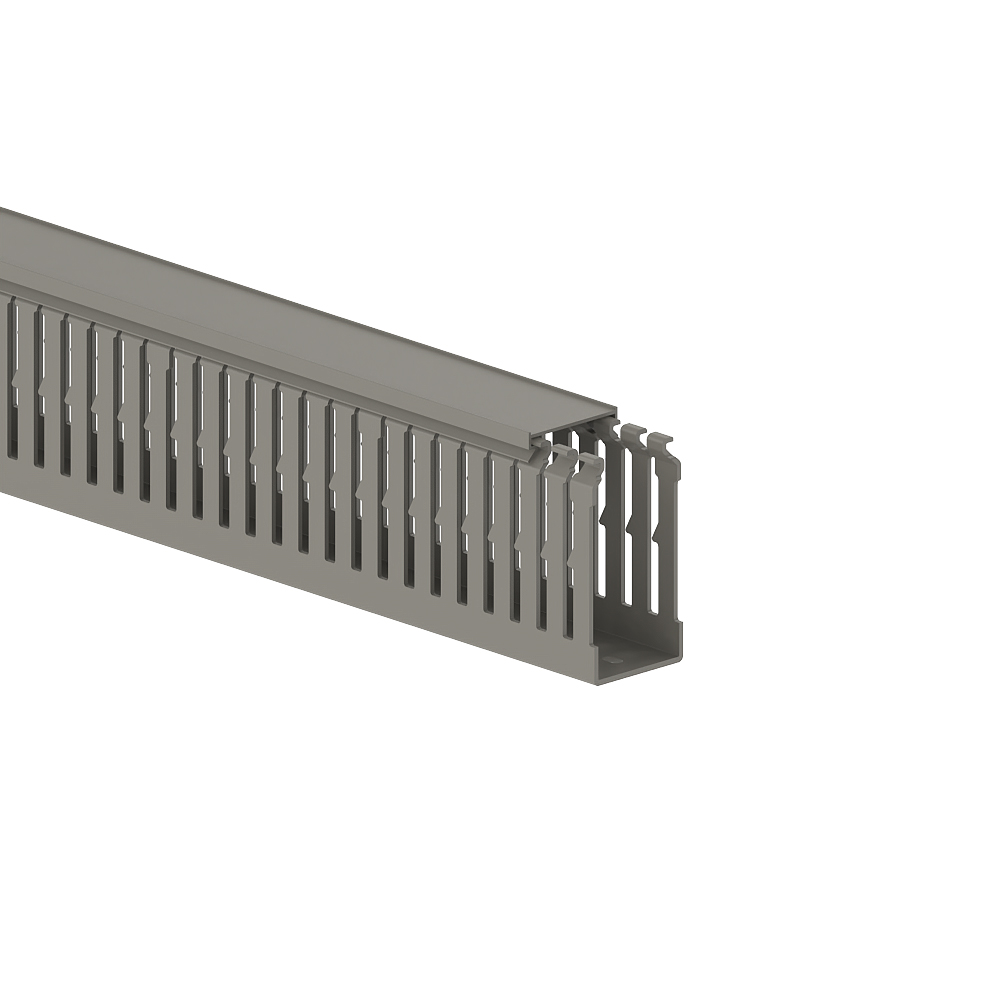 Slotted cable trunking made of PVC according to DIN EN 50085-2-3 for installation in switch cabinets, base with slotted side walls and with single-row base perforation according to DIN EN 50085-2-3, overlapping cover with a continuous labelling edge. The side bars can be broken out without tools, with the aid of notching pliers the side bars can be broken out down to the base. The wiring duct is VDE-tested and CSA-certified.