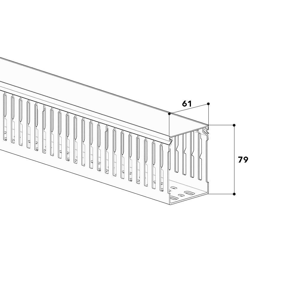 Slotted cable trunking made of PVC according to DIN EN 50085-2-3 for installation in switch cabinets, base with slotted side walls and with three-row base perforation according to DIN EN 50085-2-3, overlapping cover with a continuous labelling edge. The side bars can be broken out without tools, with the aid of notching pliers the side bars can be broken out down to the base. The wiring duct is VDE-tested and CSA-certified.